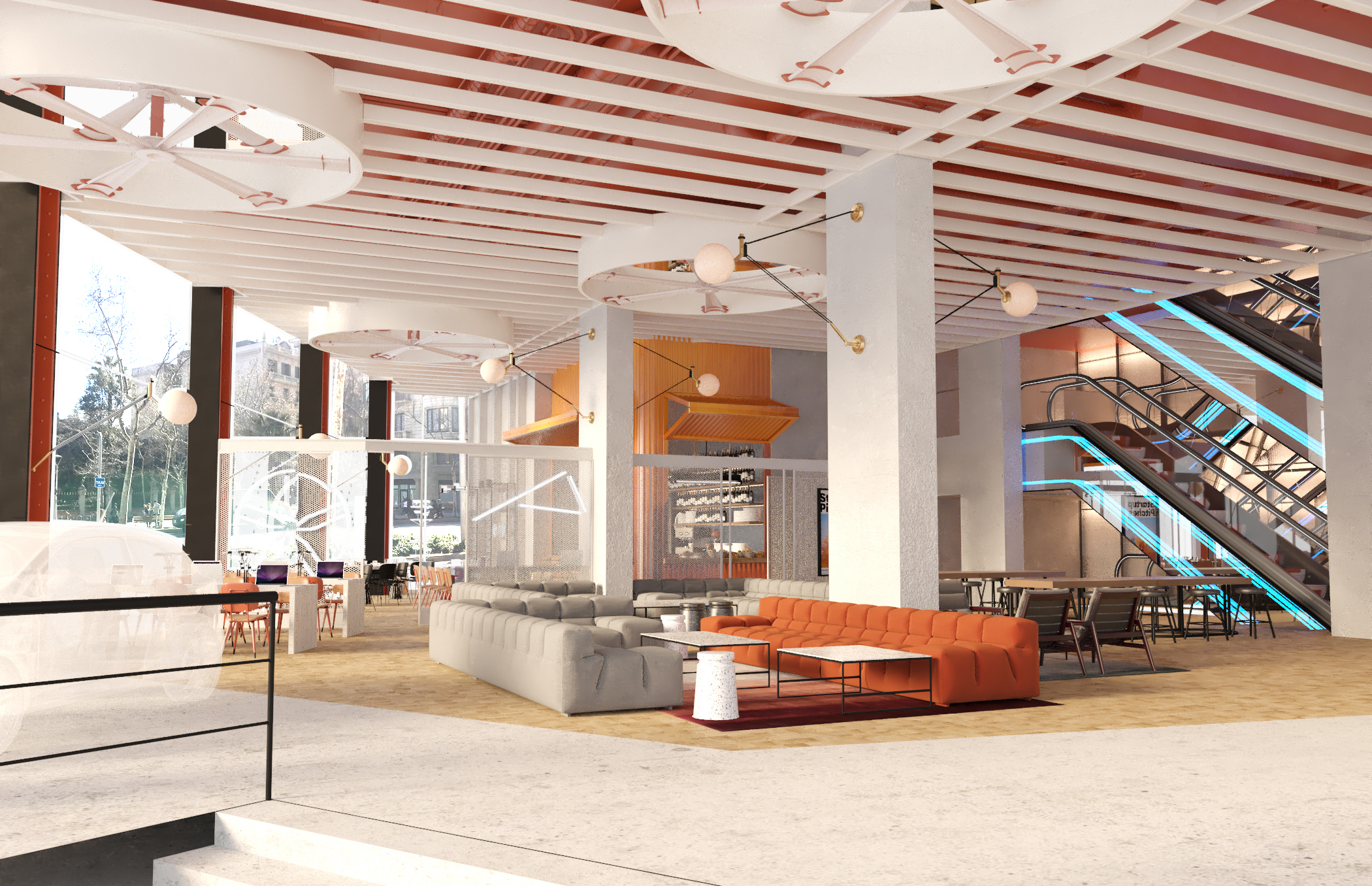 Samtidigt har Lázaro Rosa-Violán designat en interiör som med sina högklassiga material och sin breda palett av ljusa, mättade färger åstadkommer en livfull, välkomnande miljö. Det naturliga Barcelona-ljuset kommer att förstärka besökarnas upplevelse. Både det direkta ljuset som strålar in genom glasfasaden och det indirekta ljuset invändigt skapar en varm och avslappnande atmosfär som alla som besöker CASA SEAT kommer att kunna njuta av.