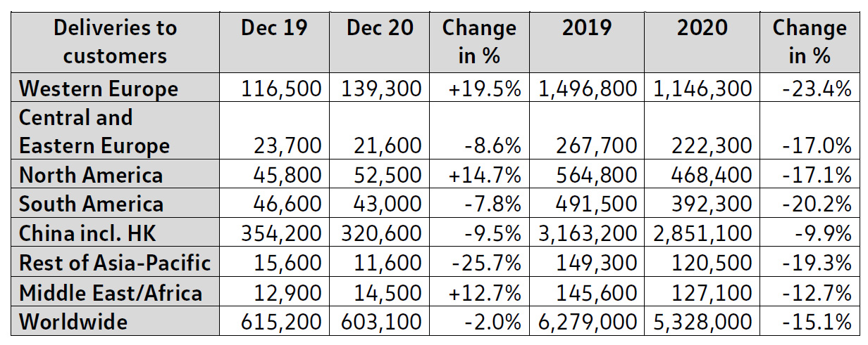 Trots en utmanande miljö på bilmarknaden levererade Volkswagen totalt cirka 5,33 miljoner till kunder runt om i världen. Det är en nedgång med cirka 15 procent jämfört med föregående år. I december fortsatte Volkswagen sin slutspurt på 2020 och låg bara något under föregående års mycket bra månadssiffror med minus två procent.