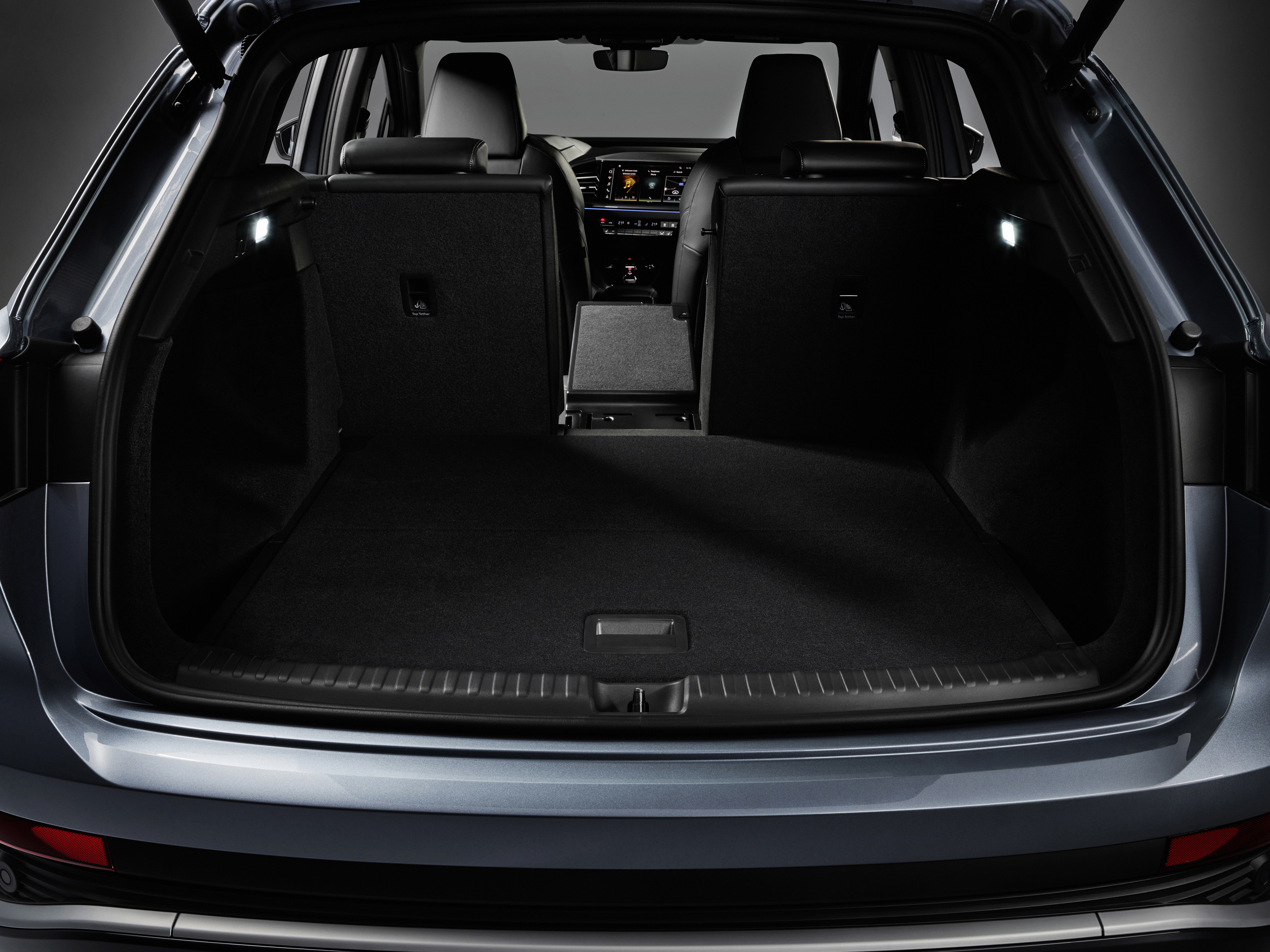 Som mångsidig familjebil är Audi Q4 e-tron rustad med gott om förvaringsutrymmen i kupén, totalt 24,8 liter inklusive handskfacket. Mittkonsolen rymmer två integrerade mugghållare, ett förvaringsutrymme på 4,4 liter, två USB typ-C uttag (fyra som tillval) och Audi phone box för trådlös laddning av mobilen som tillval. Alla fyra dörrsidor har integrerade specialfack för flaskor på upp till en liter som är placerade långt fram vid armstödet och därför lätta att nå.