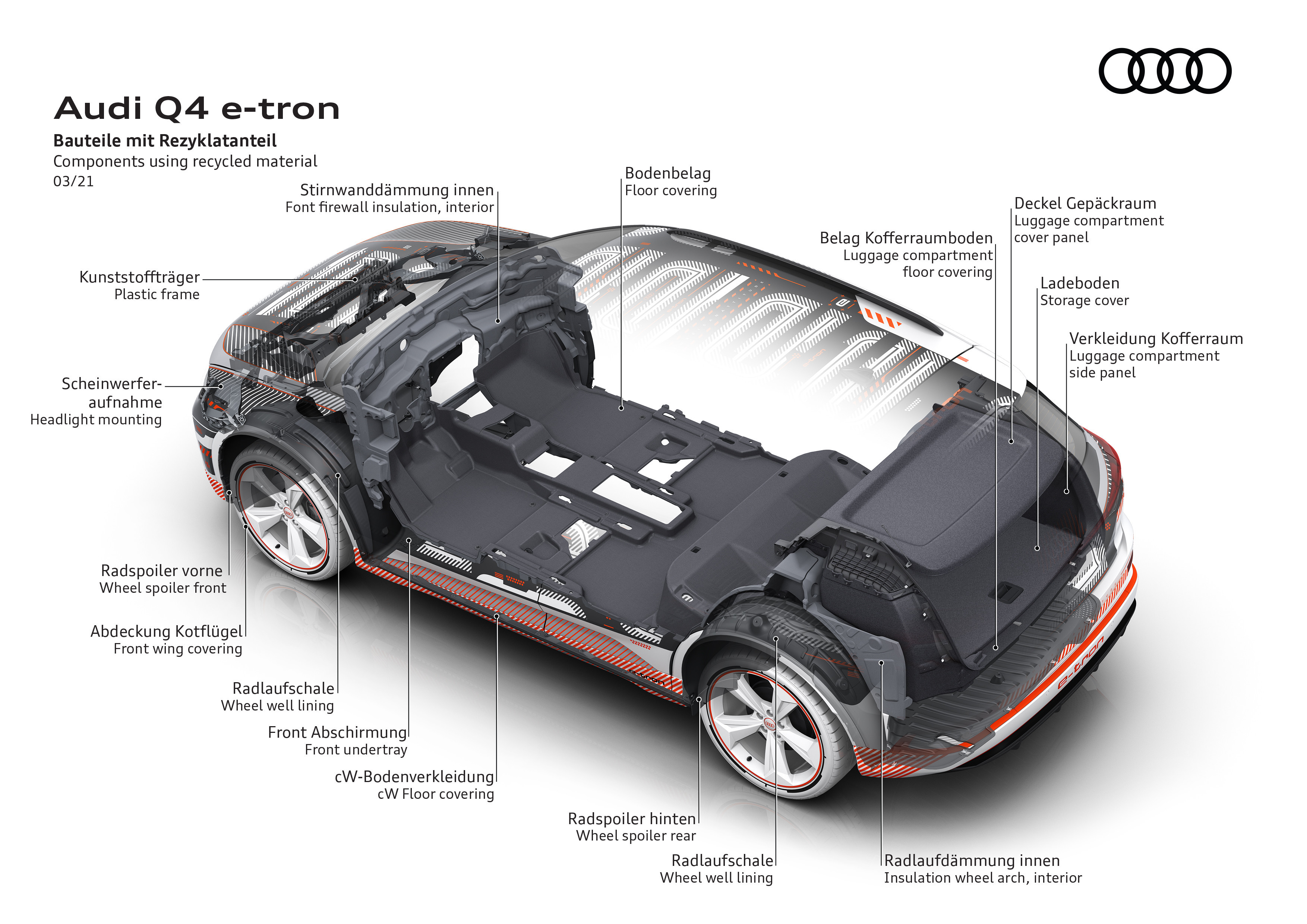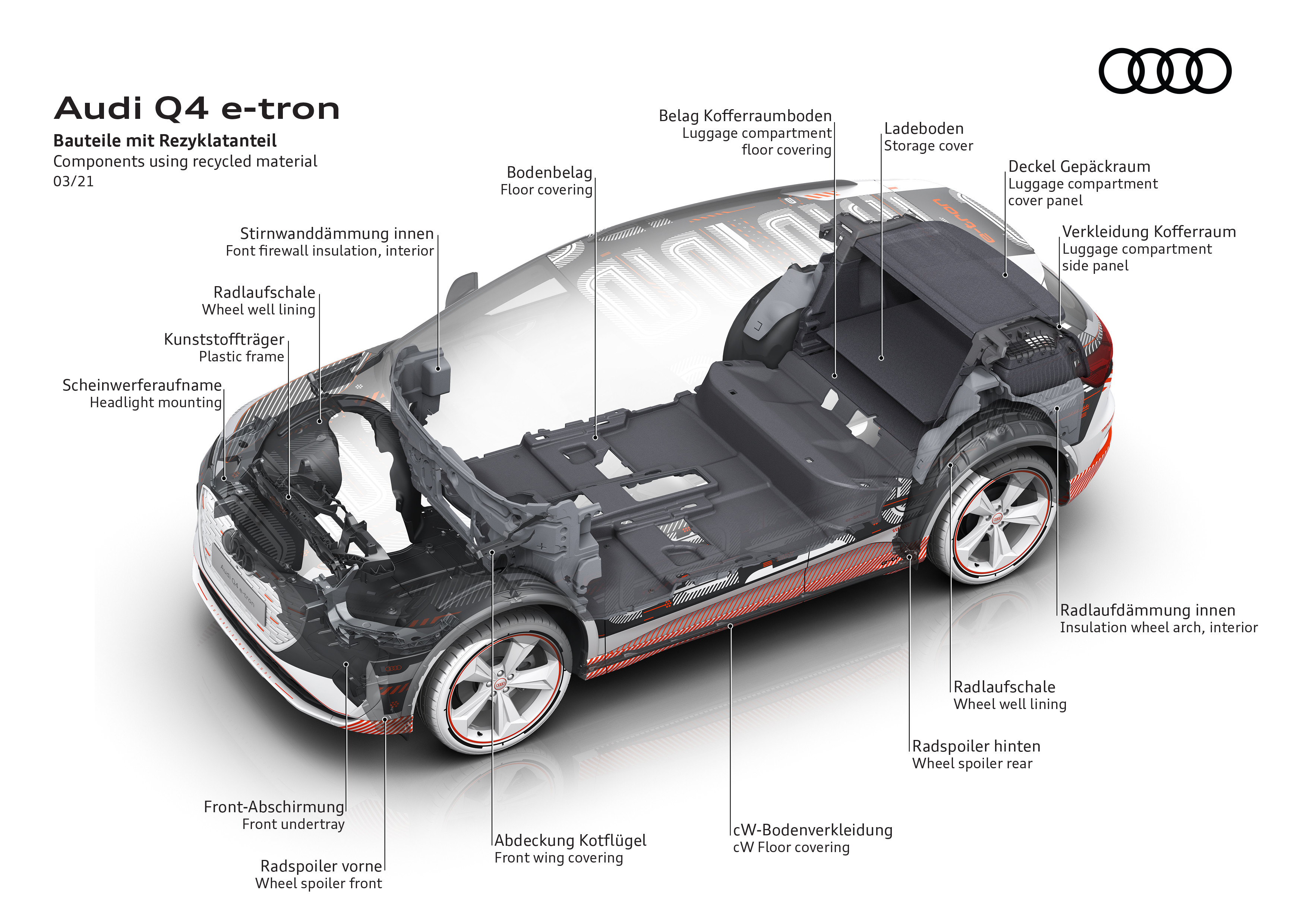 Med Q4 e-tron presenterar Audi en allsidig modell för vardag och fritid som fungerar som familjens förstabil.  Med sina 4590 millimeter i längd, 1865 millimeter i bredd och 1613 millimeter i höjd placerar sig Q4 e-tron bland de större suvarna i kompaktsegmentet. Tack vare arkitekturen i den modulära elbilsplattformen (MEB) skapas helt nya förutsättningar när det gäller innerutrymmen. Medan överhänget fram är bara 86 centimeter, mäter axelavståndet in på generösa 2,76 meter. Resultatet är ett 1,83 meter långt innerutrymme, vilket motsvarar betydligt större suvar och gör bilen lika rymlig som en konventionell SUV i de större segmenten.