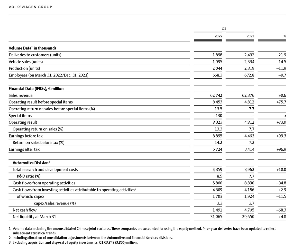 Inom divisionen Automotive ökade FoU-utgifterna med 10,0 procent till 4,4 miljarder euro på grund av betydande utvecklingsaktiviteter för framtida helelektriska modeller och tekniker. FoU-kvoten uppgick till 8,5 procent (Q1 2021: 7,7 procent). Samtidigt minskade koncernen sina investeringskostnader med 11,5 procent till 1,7 miljarder euro. Detta medförde att Capex-kvoten sjönk till 3,3 procent jämfört med 3,7 procent under föregående år.
