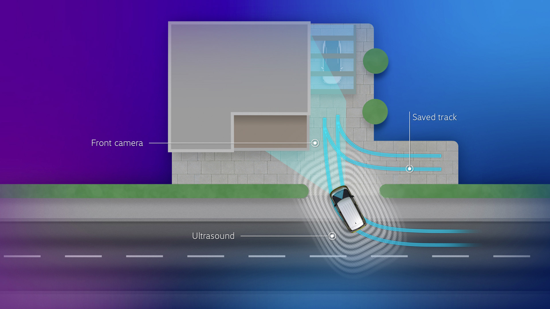 Det andra assistanssystemet (tillval) i ID. Buzz är Park Assist Plus med minnesfunktion. Detta innovativa förarhjälpsystem kan användas för att lära bilen upp till fem olika parkeringsmanövrar. Minnesfunktionen kommer ihåg parkeringsprocedurerna i hastigheter under 40 km/h och täcker avstånd på upp till 50 meter. Detta gör det möjligt att parkera bilen i till exempel i en carport eller ett garage. Föraren behöver bara parkera bilen en gång och spara parkeringsproceduren. ID. Buzz kan sedan upprepa den inlärda parkeringsmanövern på egen hand. Allt föraren behöver göra är att övervaka situationen.