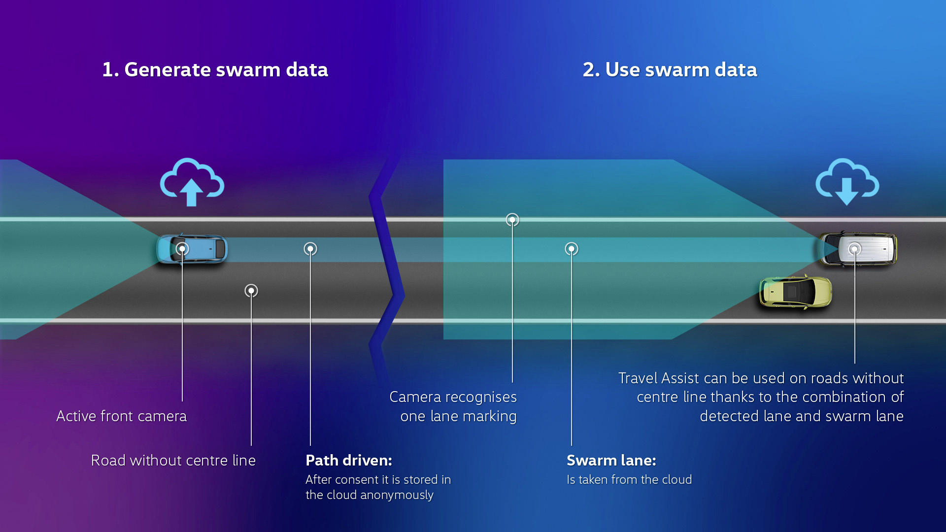 Nya Travel Assist-funktioner. Om anonymiserade svärmdata finns att tillgå från andra Volkswagen-modeller, kan Travel Assist med svärmdata använda en enda identifierad vägmarkering för att hålla bilen kvar i sitt körfält. I detta fall kan assistanssystemet även var aktivt på landsvägar utan till exempel en körfältsmarkering i mitten. Travel Assist blir alltså mer användbart genom svärmdata, vilket förbättrar komforten och assistansnivån för kunden.