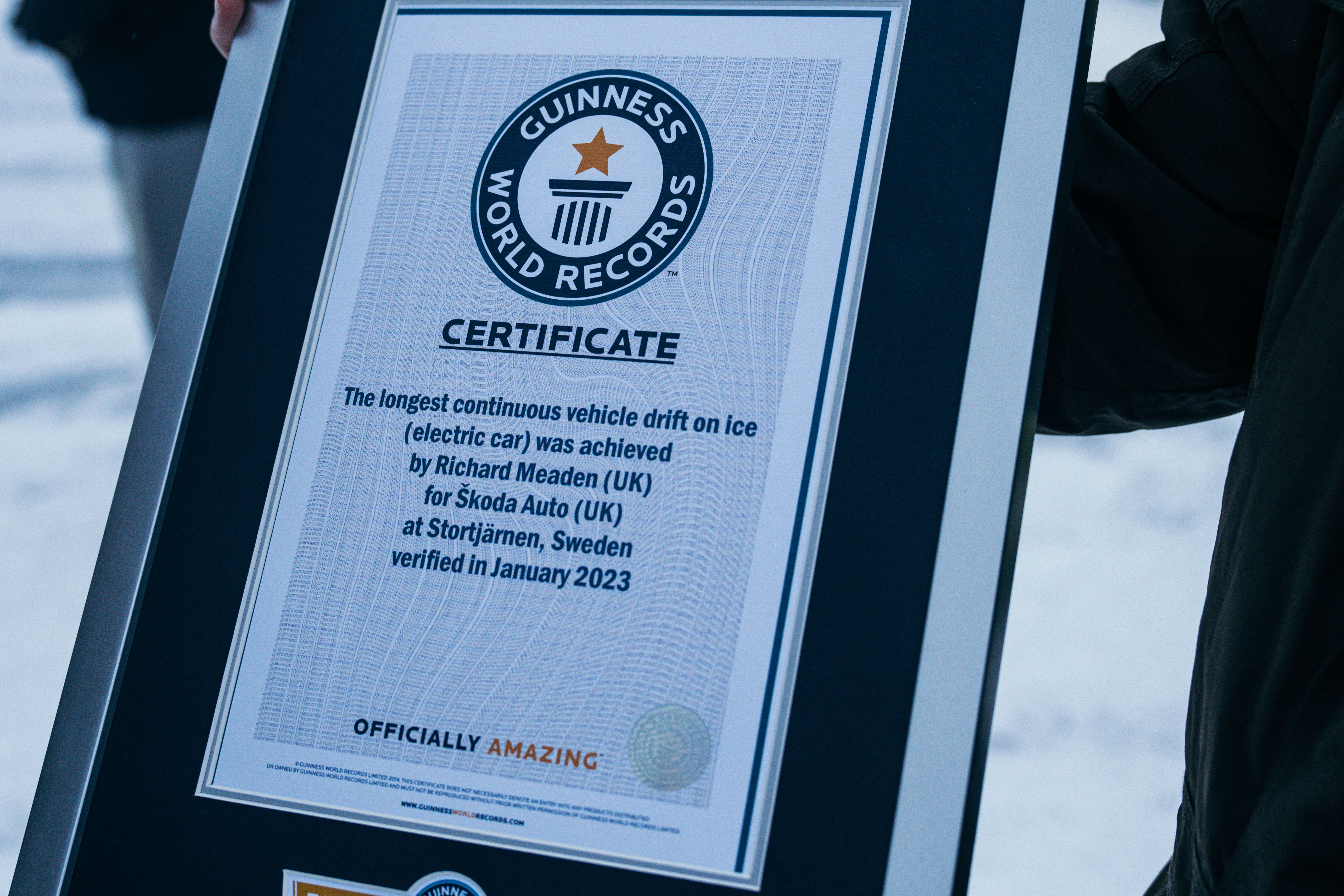 › Enyaq RS iV körd av motorjournalisten Richard Meaden kammade hem GUINNESS WORLD RECORDS-titel för "Longest Continuous Vehicle Drift on Ice" efter att ha nått sträckan 7,351 km › Škoda satte också ett nytt GUINNESS WORLD RECORD i motsvarande elbilsklass i samma fordon › Rekorden sattes på den isbelagda sjön, Stortjärnen, nära Östersund, klockan 11:05 den 19 januari 2023