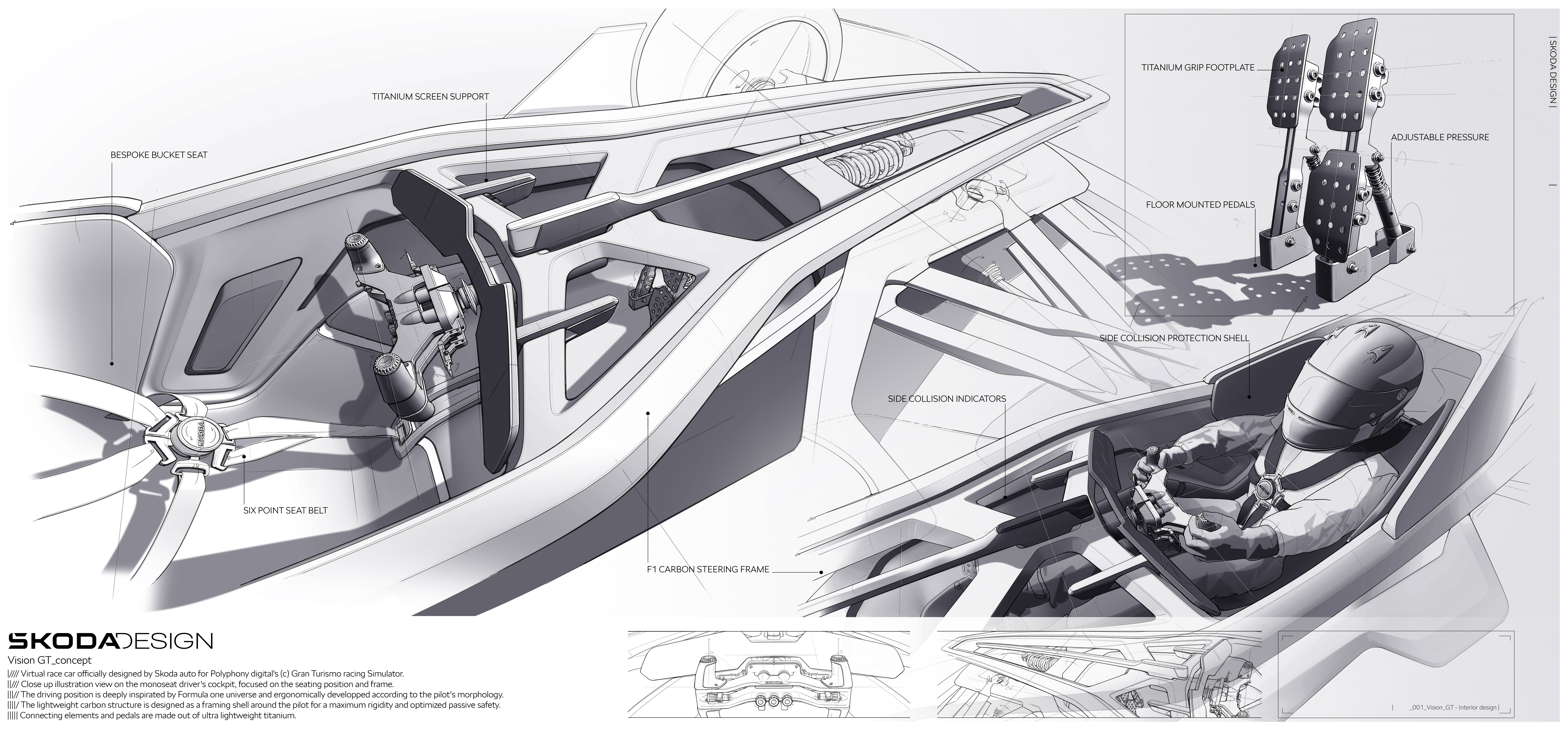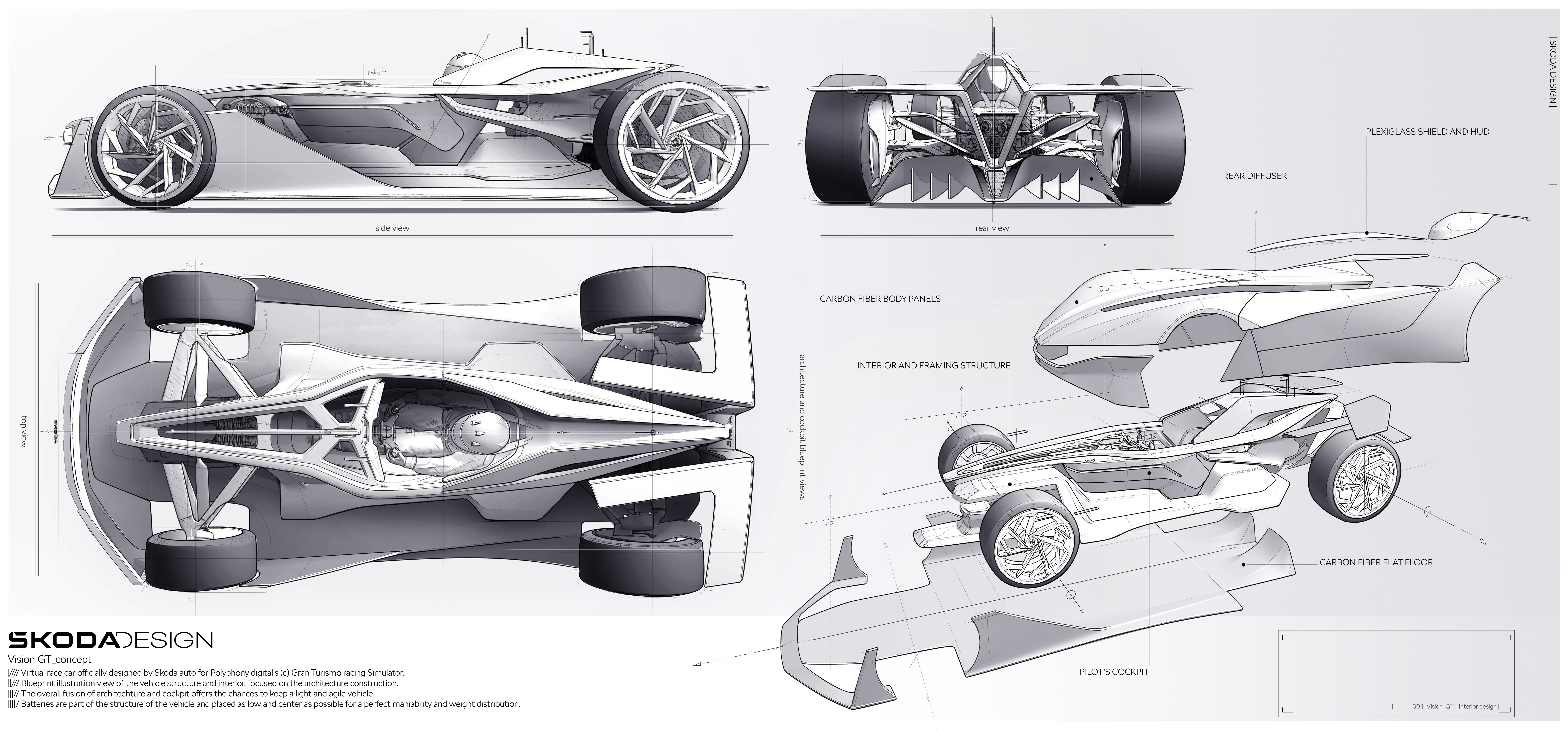 Den virtuella Škoda Vision Gran Turismo hämtar inspiration från den verkliga Škoda 1100 OHC Spider från 1957. Med Škodas designchef Oliver Stefani i spetsen, har Škodas designteam skapat en spektakulär en-sitsig helelektrisk virtuell bil som kombinerar designelement från den legendariska 1100 OHC med flera nya detaljer som exempelvis en delad bakvinge. På Škoda Vision Gran Turismo skymtas också en del karaktäristiska drag från Škodas designspråk Modern Solid. Exempel är de T-formade lyktorna och den matta färgen Explorer Green