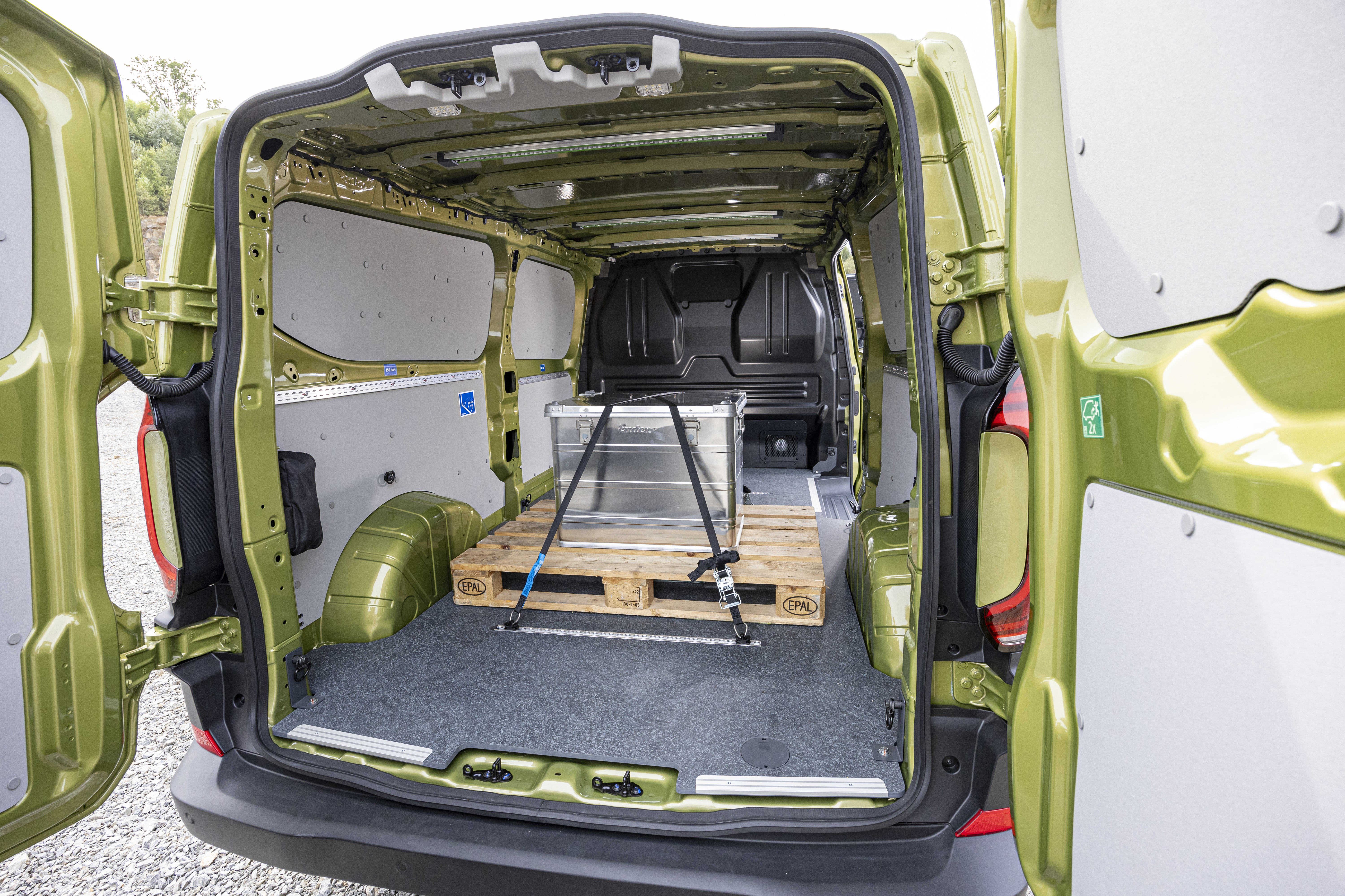 Betydligt mer utrymmen: Den maximala bredden mellan hjulhusen har ökats med 148 mm till 1 392 mm. Lastutrymmets längd vid golvet i Transporter med kort axelavstånd är 2 602 mm – vilket motsvarar en förbättring med 61 mm. Med långt axelavstånd ökar lastutrymmets längd vid golvet till 3 002 mm. Tack vare denna större längd och bredd har Volkswagen Transportbilar kunnat öka lastkapaciteten avsevärt. Lastvolymen för skåpbilar med normalt axelavstånd och normalt tak är nu 5,8 m3 (T6,1: 5,5 m3). Versionen med långt axelavstånd och högt tak rymmer upp till 9,0 m3. Den förlängda transportbilen rymmer nu även tre europapallar istället för två. Som enda transportbil med öppet flak och dubbelhytt debuterar flakmodellen i totalviktsklassen upp till 3,2 ton senare under året. Flaket är 2 169 mm långt och 1 945 mm brett (invändiga mått).