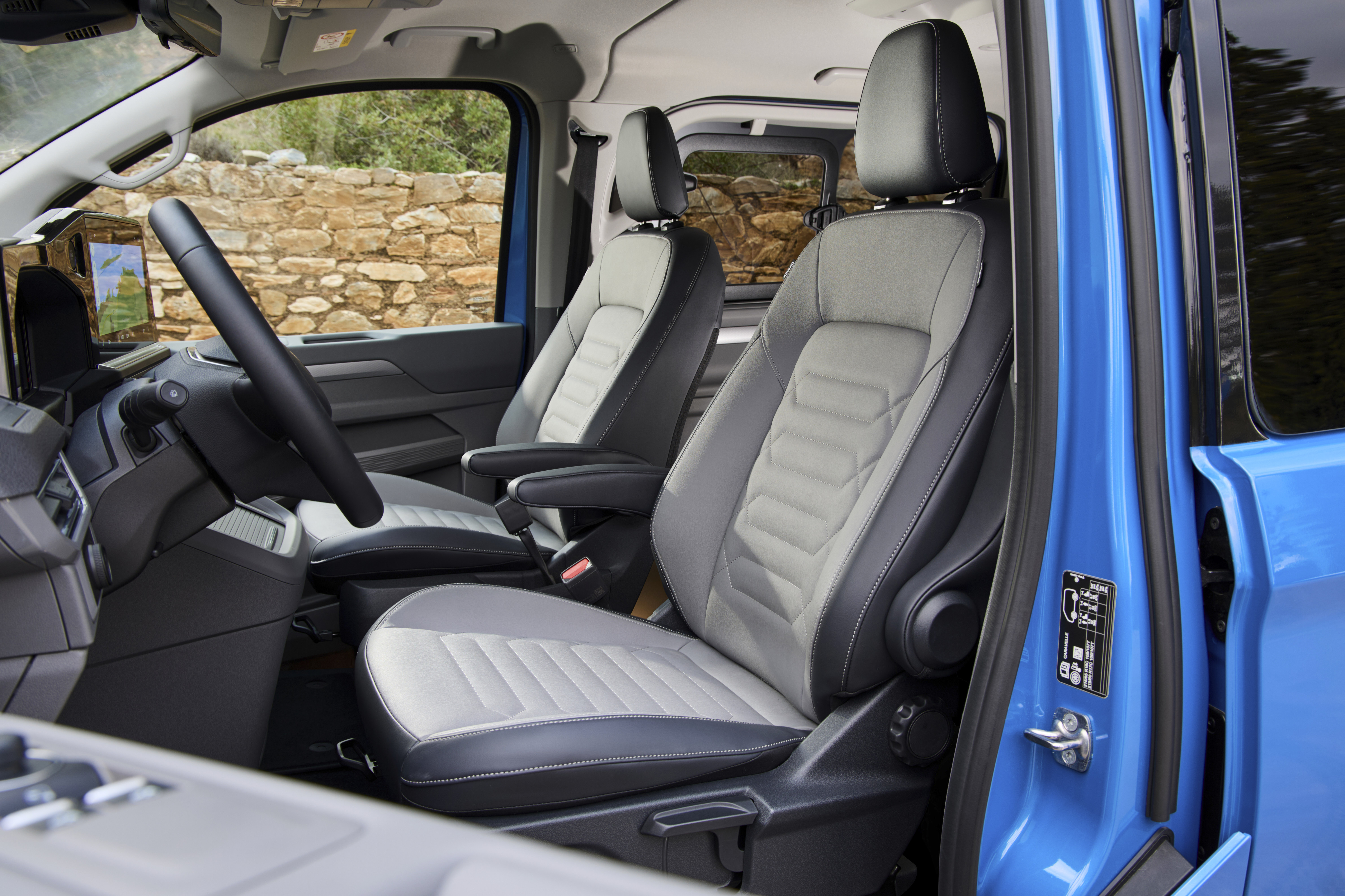 Digital cockpitmiljö: Nya Transporter och Caravelle startas med en knapp från Keyless Start-systemet som sitter på instrumentbrädan. Det nya digitala landskapet för föraren sträcker sig till vänster och höger om startknappen på en visuell axel. Den består av det 12-tums digitala instrumentklustret (Digital Cockpit med 30 cm diagonal) och 13-tums pekskärmen (33 cm diagonal) för infotainmentsystemet (inklusive DAB+ och trådlös App-Connect för Apple CarPlay/Android Auto). Det finns en 5G-modul ombord för uppdateringar och digital dataöverföring. För första gången i ett nyttofordon från Volkswagen finns en digital innerbackspegeln som tillval för fri sikt bakåt under körning. En dashcam-funktion är dessutom integrerad i spegeln.