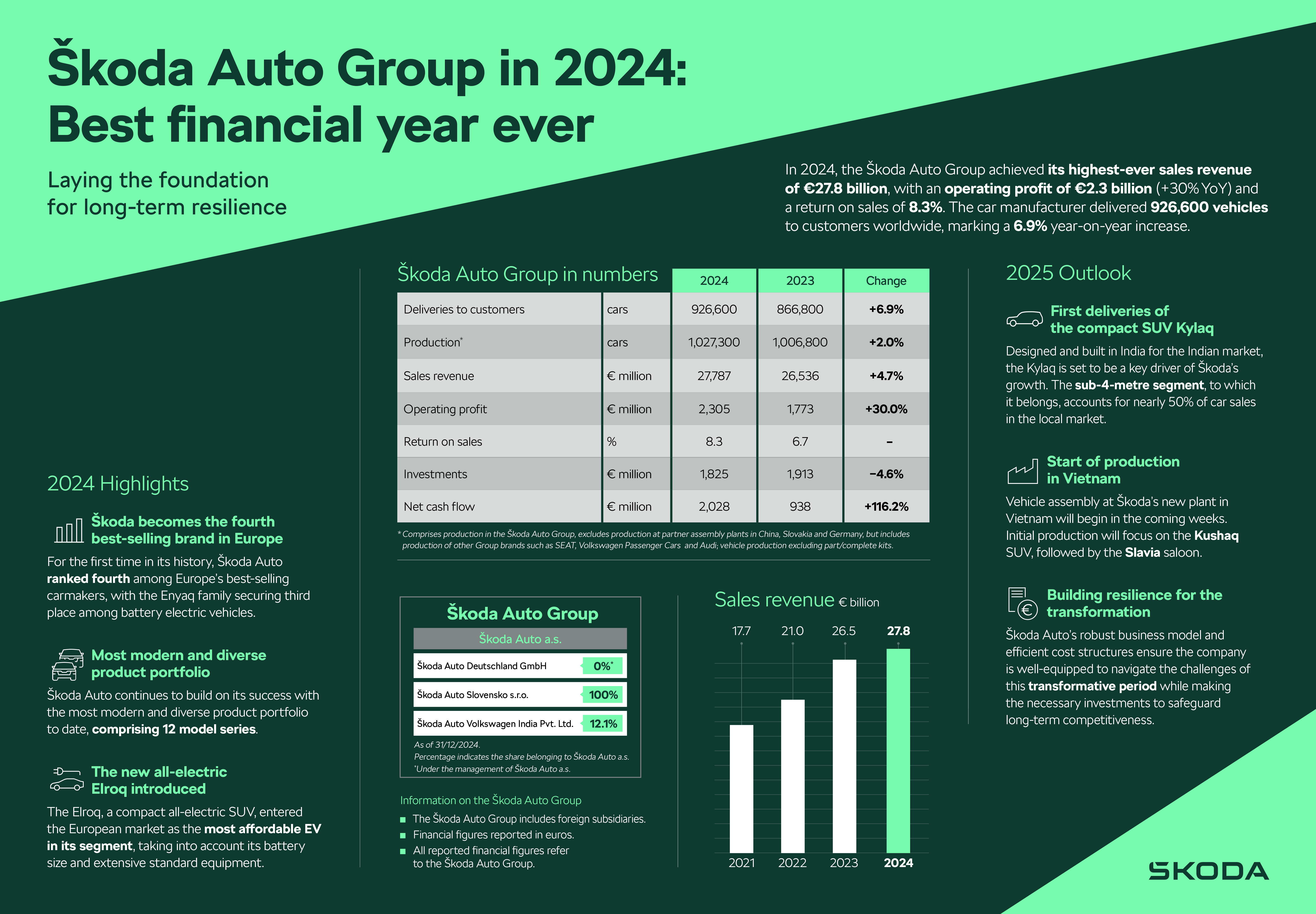 • Enastående finansiellt resultat: Škoda Auto Group nådde rekordomsättning på 27,8 miljarder euro, rörelseresultat på 2,3 miljarder euro och en rörelsemarginal på 8,3 % • Redo för framtidens utmaningar: Starka resultat ger bolaget en stabil plattform för fortsatt transformation • Den mest moderna modellportföljen i bolagets historia: 926 600 bilar levererades globalt (+6,9 % ) • Fördubblade ambitioner för elbilsförsäljning 2025: Lansering av helt nya Elroq och uppdaterade Enyaq