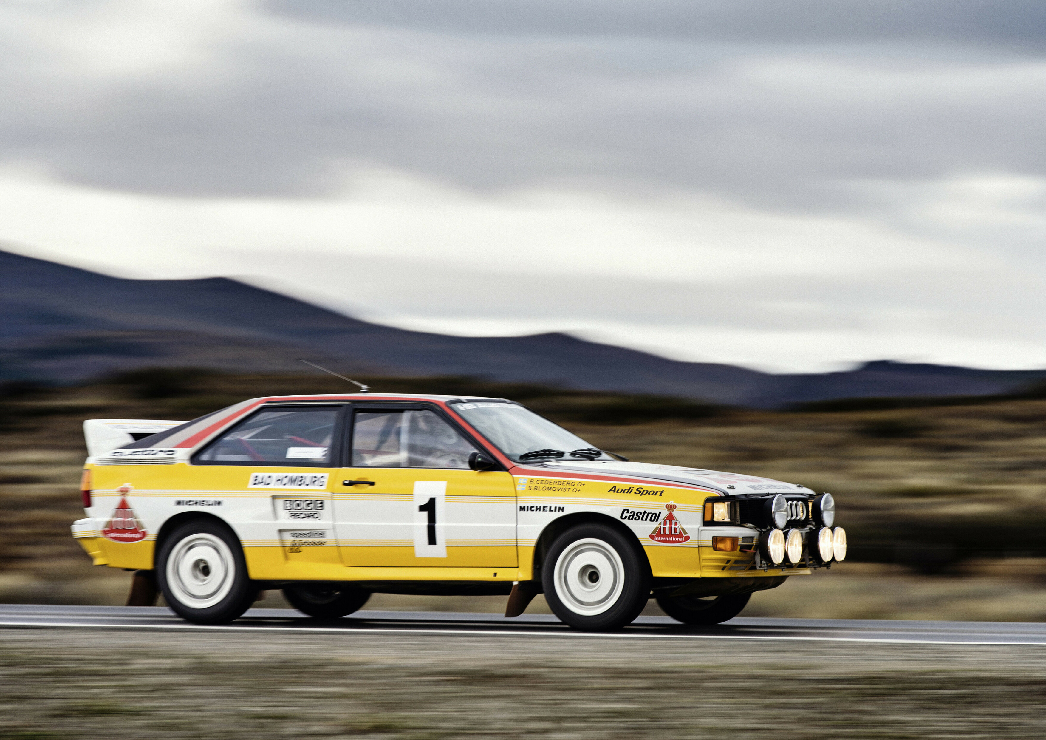 Den femcylindriga bensinmotorn blev ännu större i urquattron från 1980. Med turboladdning, laddluftskylning och permanent fyrhjulsdrift bildade den ett kraftfullt teknikpaket för både motorsport och landväg. Vid försäljningsstarten hade den en effekt på 200 hk. Efter att Audi 1982 säkrade märkesmästerskapet i rally-VM vann finländaren Hannu Mikkola förartiteln i rallyvärdsmästerskapet ett år senare. 1983 lanserades Audi Sport quattro, som var 24 centimeter kortare och hade bredare spårvidd. En nyutvecklad fyrventils-, femcylindrig lättmetallmotor på 306 hk gjorde Sportquattron till den kraftfullaste bilen för allmän väg från ett tyskt bilmärke vid den tiden. Modellen lade grunden för en ny rallybil i grupp B, där fyrventilsmotorn redan från start levererade 450 hk. Den användes för första gången i det näst sista rallyt 1984, Elfenbenskustrallyt. De återstående elva tävlingarna tävlade Stig Blomqvist med den 360 hk starka Audi quattro A2, grupp B. Som bekant vann Stig Blomqvist förartiteln och Audi märkesmästerskapet i rally-VM 1984.