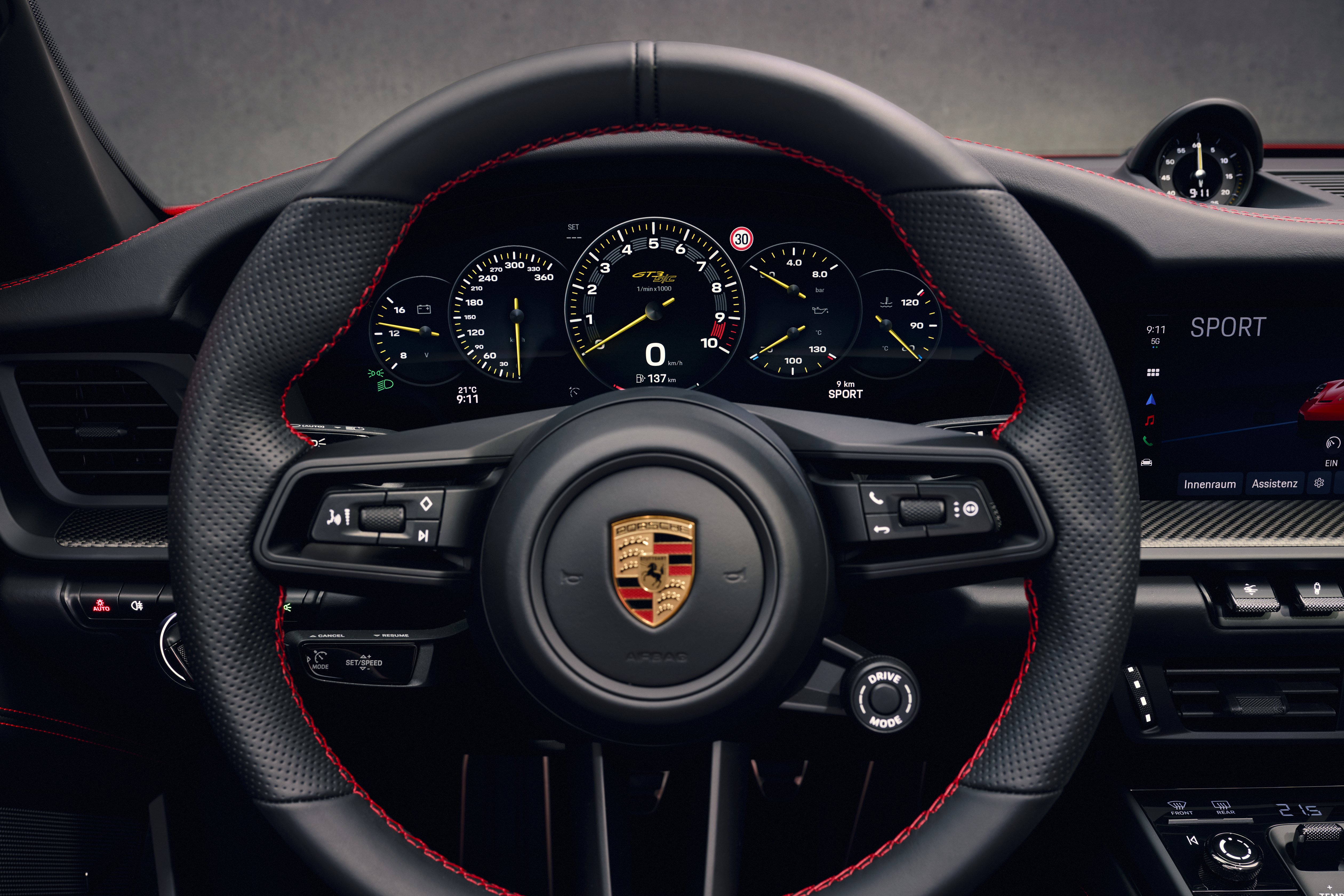 Interiören har lättade mattor och lättade dörrpaneler med draghandtag i kolfiber – ytterligare designdetaljer hämtade från 911 S/T. 911 GT3 S/C är byggd som en tvåsitsig bil med fyrvägs justerbara Sportstolar Plus som standard. Som tillval finns lätta skalstolar i kolfiber, med fällbart ryggstöd, integrerad krockkudde, elektrisk höjdinställning och manuell inställning i längsled. Som tillval finns även trestegs stolsvärme. Interiören är som standard klädd i svart läder – inklusive solskydd och insida av A-stolpar. En GT3 S/C-logotyp är broderad på mitten av den bakre torpedväggsinklädnaden. Stolarnas mittsektioner är klädda med perforerat läder. Precis som på 911 S/T är ratten klädd i perforerat läder och precis som hos den nuvarande 911 GT3 startas GT3 S/C inte med en knapptryckning utan med en vridbar tändningsomkopplare till vänster om ratten. Det digitala kombiinstrumentet stöder föraren med ett överskådligt indikerings- och manöverkoncept. Visningsläget ”Track Screen” reducerar de digitala indikeringarna till vänster och höger om varvräknaren till viktiga data om däck, olja, kylarvätska och bränsle. Växlingslamporna till vänster och höger om varvräknaren visar optimal tidpunkt för växling. Om så önskas kan displayen vridas så att varvtalsgränsen på 9 000 v/min är placerad vid klockan 12-markeringen.