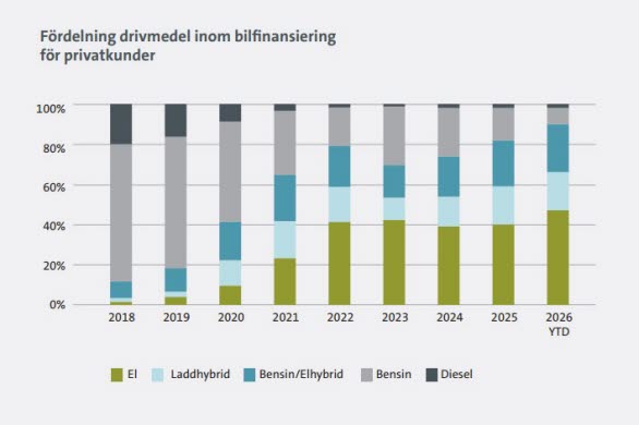 Lån och leasing fortsätter att spela en stor roll för övergången till elbilar. Lån och Privatleasing driver upp andelen nya elbilar på privatmarknaden där de renodlade elbilarna nu är upp i 47 procent. På företagsmarknaden är andelen elbilar nu nästan 60 procent bland de företag som väljer leasing. Andelen leasing på företagsmarknaden ökade med tre procentenhetertill 95 procent. Av de leasade företagsbilarna är nästan nio av tio laddbara