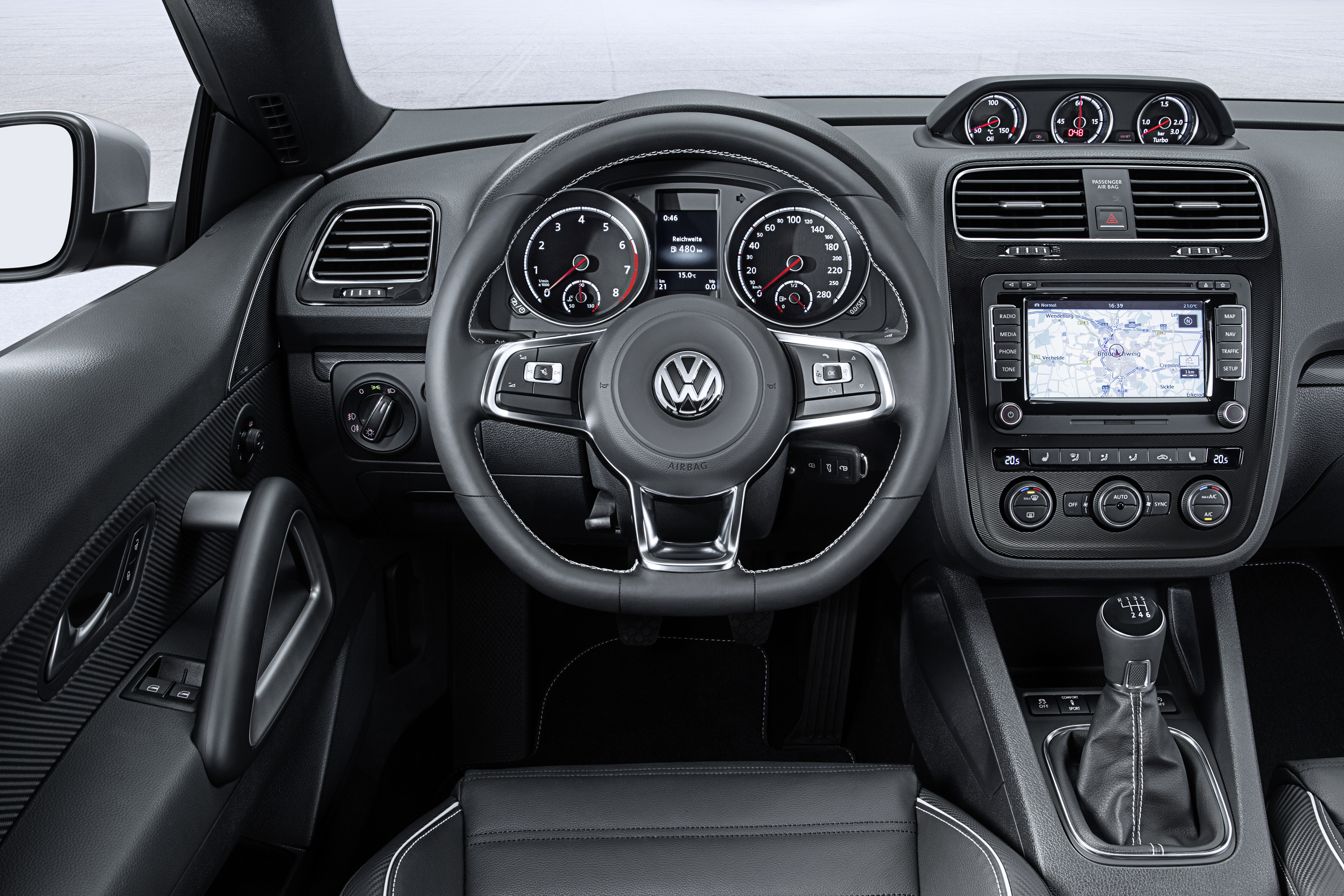 Scirocco R invändigt. Precis som exteriören på Scirocco R är det Volkswagen R GmbH som satt sin prägel på bilen även invändigt. Till de individualiserade detaljerna hör sätesklädseln ”Race”, som pryds av en ”R”-logo och kristallgrå dekorsömmar, det svarta innertaket, dekorinläggen ”Carbon Race”, dekor i högblank pianosvart lack ”Piano Black” (på radions front, den läderklädda multifunktionssportratten och dörrhandtagen) samt pedaler i rostfritt stål. De speciella ”R”-visarnålarna är traditionsenligt blå och instegslisterna av aluminium har dekorerats med en ”R”-logo.