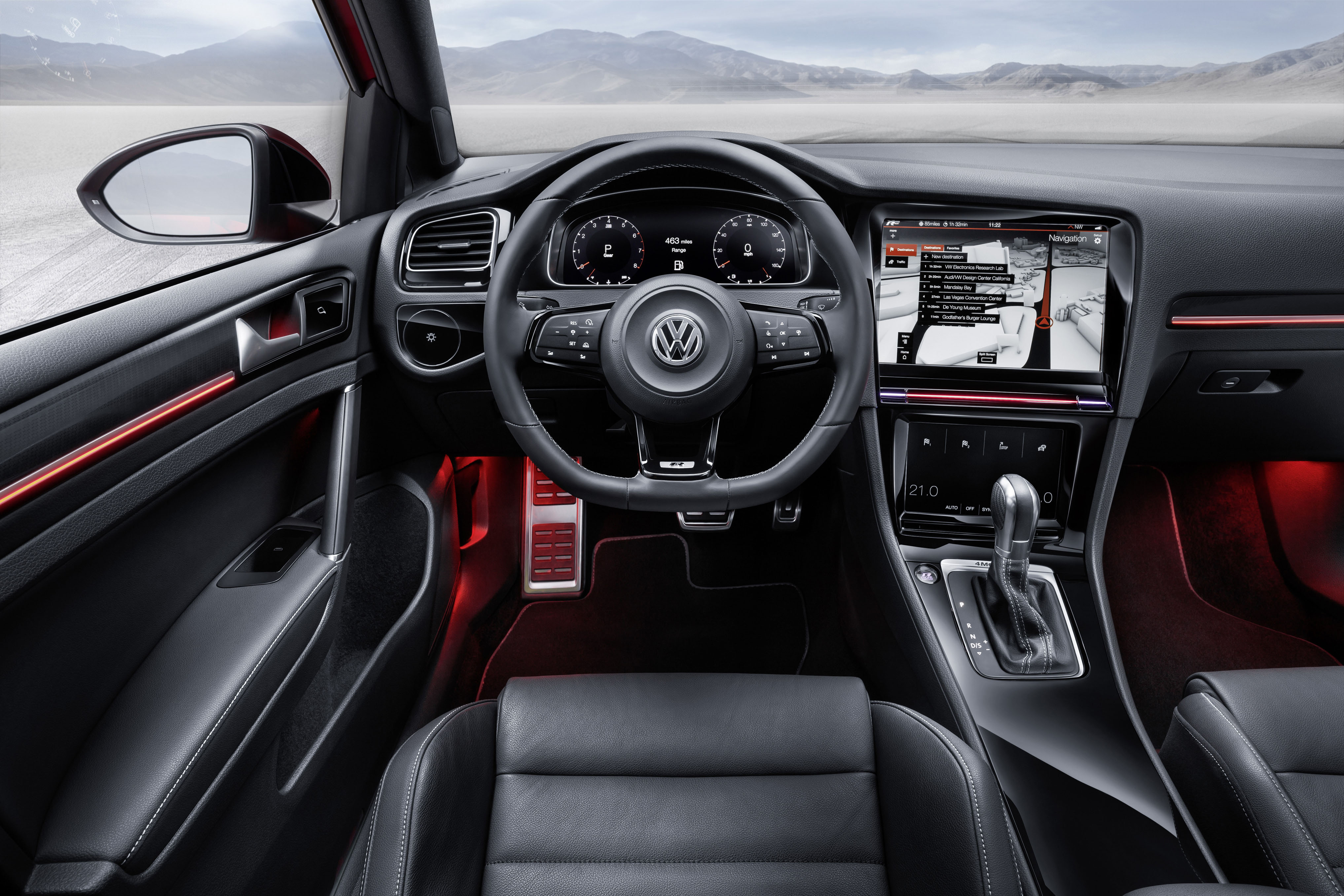 Hos Golf R Touch styrs de flesta systemen via pekskärmar och sensorer. Bilen är utrustad med tre skärmar. En 12,8-tum högupplöst pekskärm för infotainmentsystemet, ett Control Center (8,0-tum med pekfeedback) som är placerad strax där under varifrån man styr bland annat mediebiblioteket och klimatanläggningen samt centralinstrumentet bestående av en Active Info Display (en 12,3 tums display). Layouten på pekskärmen i mitten och Active Info Display kan snabbt anpassas, precis som på en smartphone eller surfplatta idag. Samma sak gäller för färgen hos interiörens ambientebelysning.