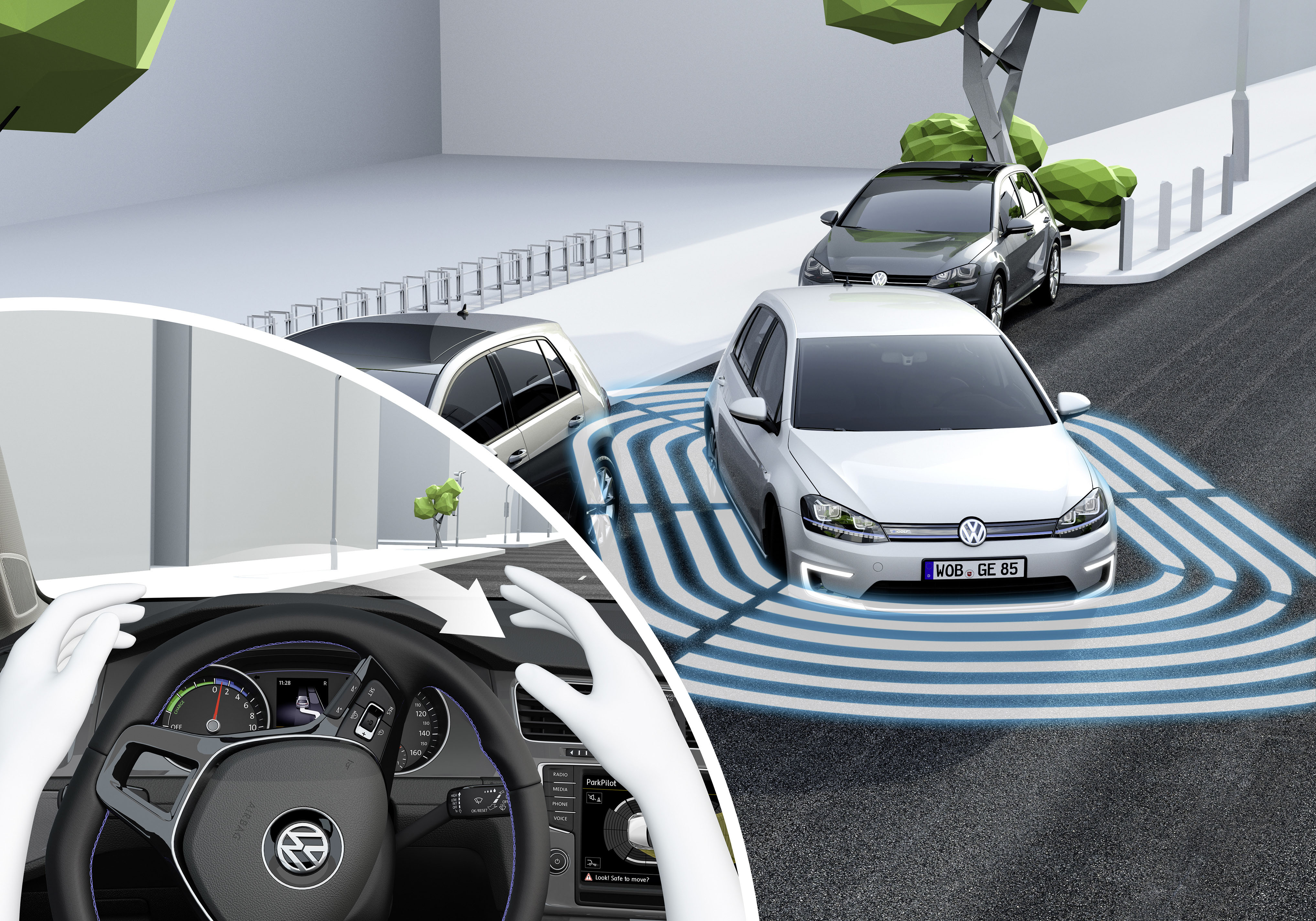 På CES i Las Vegas presenterar Volkswagen nästa utvecklingsfas för Park Assist: Trained Parking. Detta ger bilen (en e-Golf) möjlighet att parkera mycket exakt genom att använda sig av sensorer i kombination av en kamera, placerad längst ner på den inre backspegeln, assisterat av en adaptiv elektronik. Detta system är fortfarande under utveckling, men det står redan klart att det kommer innebära ett stort framsteg.