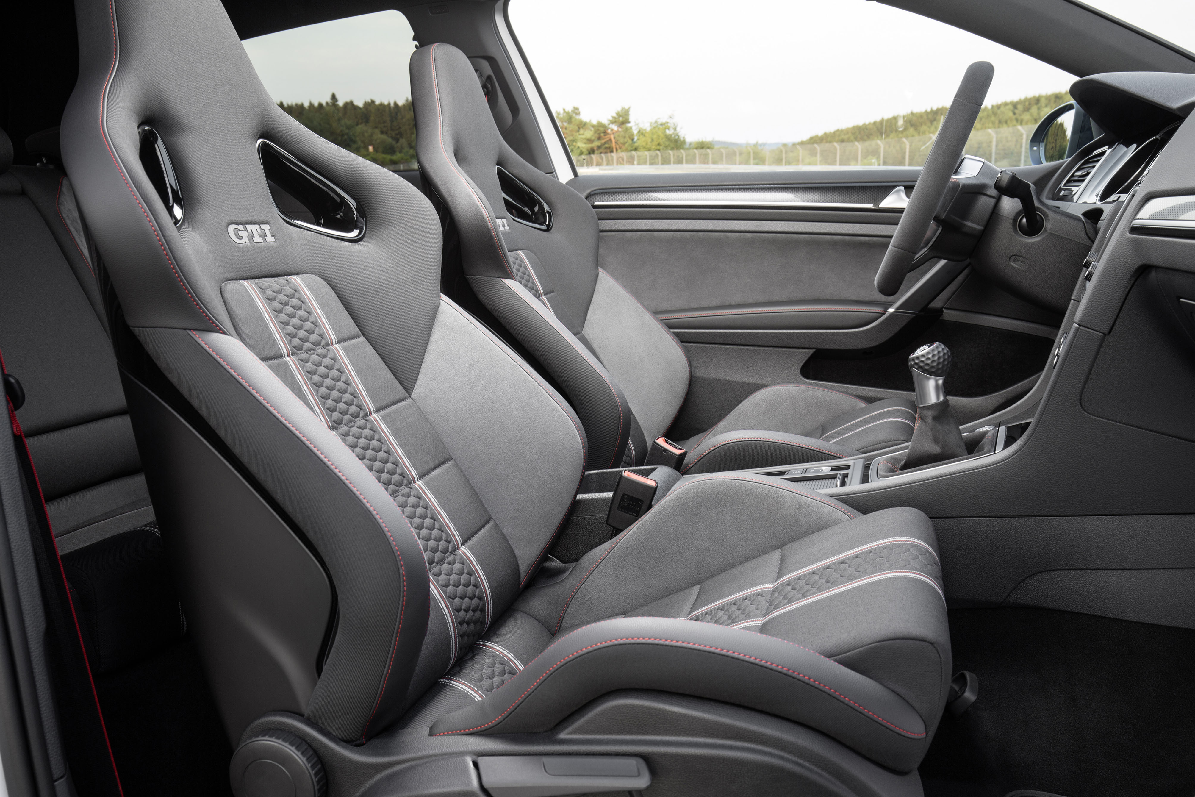 Jubileumsmodellen kan också utrustas med skålade racingstolar istället för med sportsäten. Stolarna är delvis klädda i Alcantara och är bikakemönstrade på ryggstödet och sitsen. Ryggstödet pryds av en GTI-logo. Den röda linjen på säkerhetsbältena är en annan effektfull detalj. Nya dekorlister i ”Honeycomb 40”-design (på instrumentpanelen, mittkonsolen och dörrarna) ger interiören en ännu exklusivare look.
