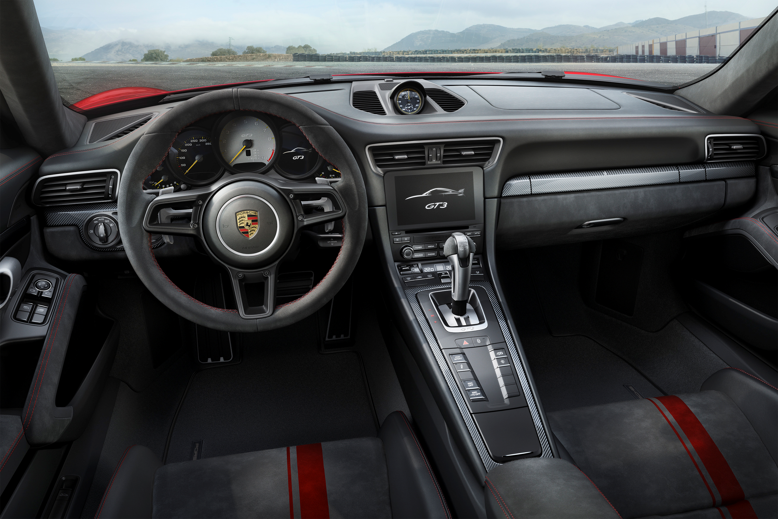 Inredningen i den nya högprestandamodellen är skräddarsydd för körupplevelsen i 911 GT3. Sportratten med en diameter av 360 mm kommer från 918 Spyder. Både föraren och passageraren kan uppleva bilens egenskaper i Porsche Sportstolar Plus med mekanisk justering framåt och bakåt. Stolens höjd och ryggstödet justeras elektriskt. Eftersom 911 GT3 av tradition är tvåsitsig är skålningen för baksätet övertäckt.