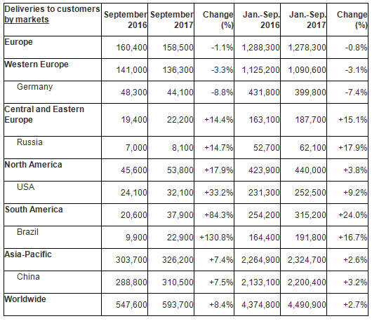 Hittills i år, januari-september, har 4,49 miljoner Volkswagen personbilar levererats. Det motsvarar en ökning med 2,7 procent jämfört med föregående år. Tillväxten i tredje kvartalet var 7 procent högre än samma kvartal föregående år.