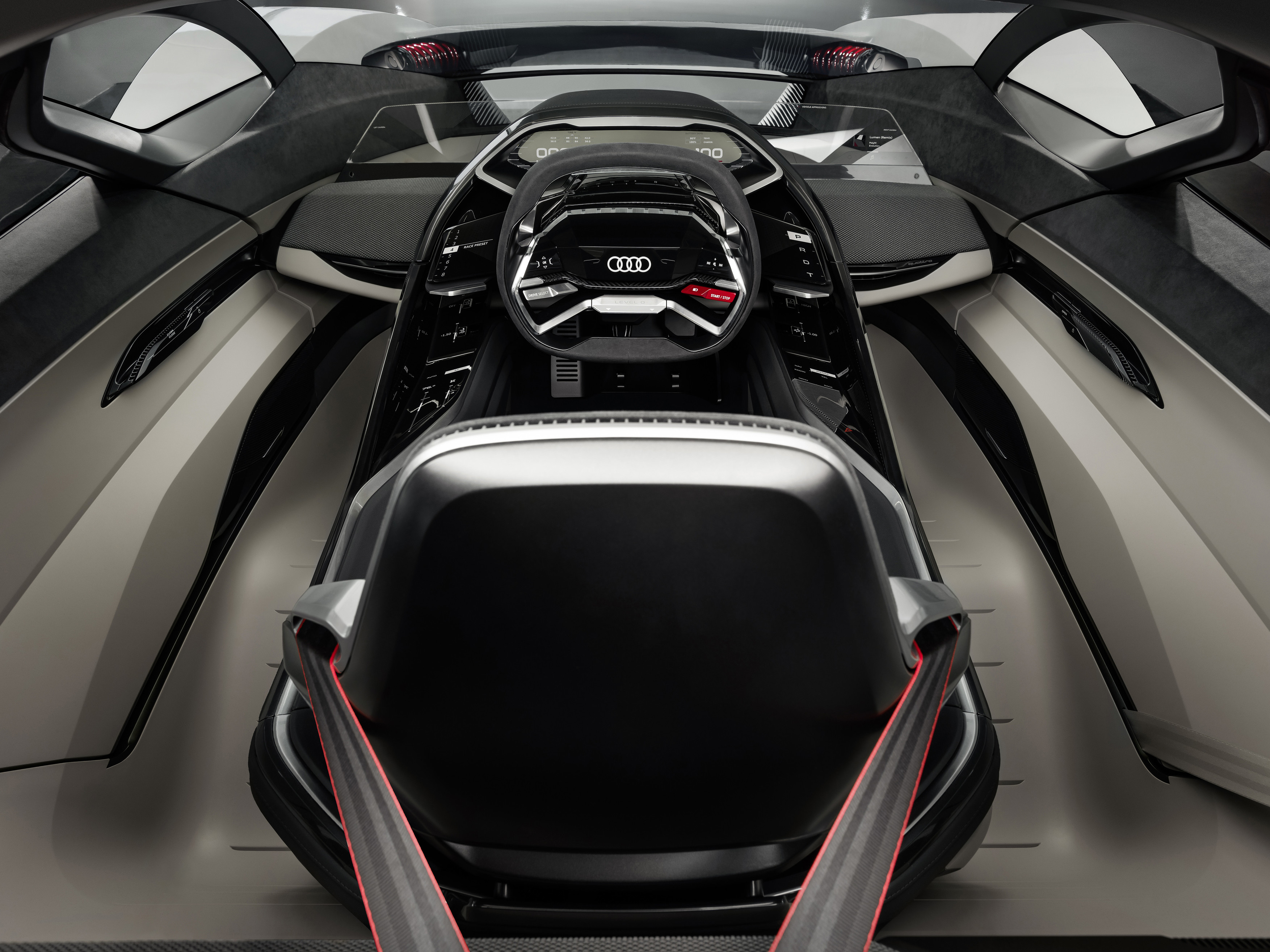 Det interna arbetsnamnet hos Audi var “Level Zero” – ett tydligt statement för att differentiera sig från nivå 3, 4 och 5 av autonom körning som annars har stort fokus hos Audi för närvarande. I Audi PB18 e-tron är det endast föraren som styr, gasar och bromsar. Därmed finns det varken komplexa system för automatiserad körning eller komfortdetaljer som adderar vikt. Istället finns ett förarsäte och en cockpit som är integrerade i en inre monocoque som kan skjutas sidledes. Med enbart föraren i bilen kan monocoquen placeras i mitten av bilen som en monoposto – den perfekta placeringen för racingbanan. Det är möjligt inte minst tack vare by-wire konstruktionen för styrning och pedaler; en mekanisk förbindelse behövs inte.