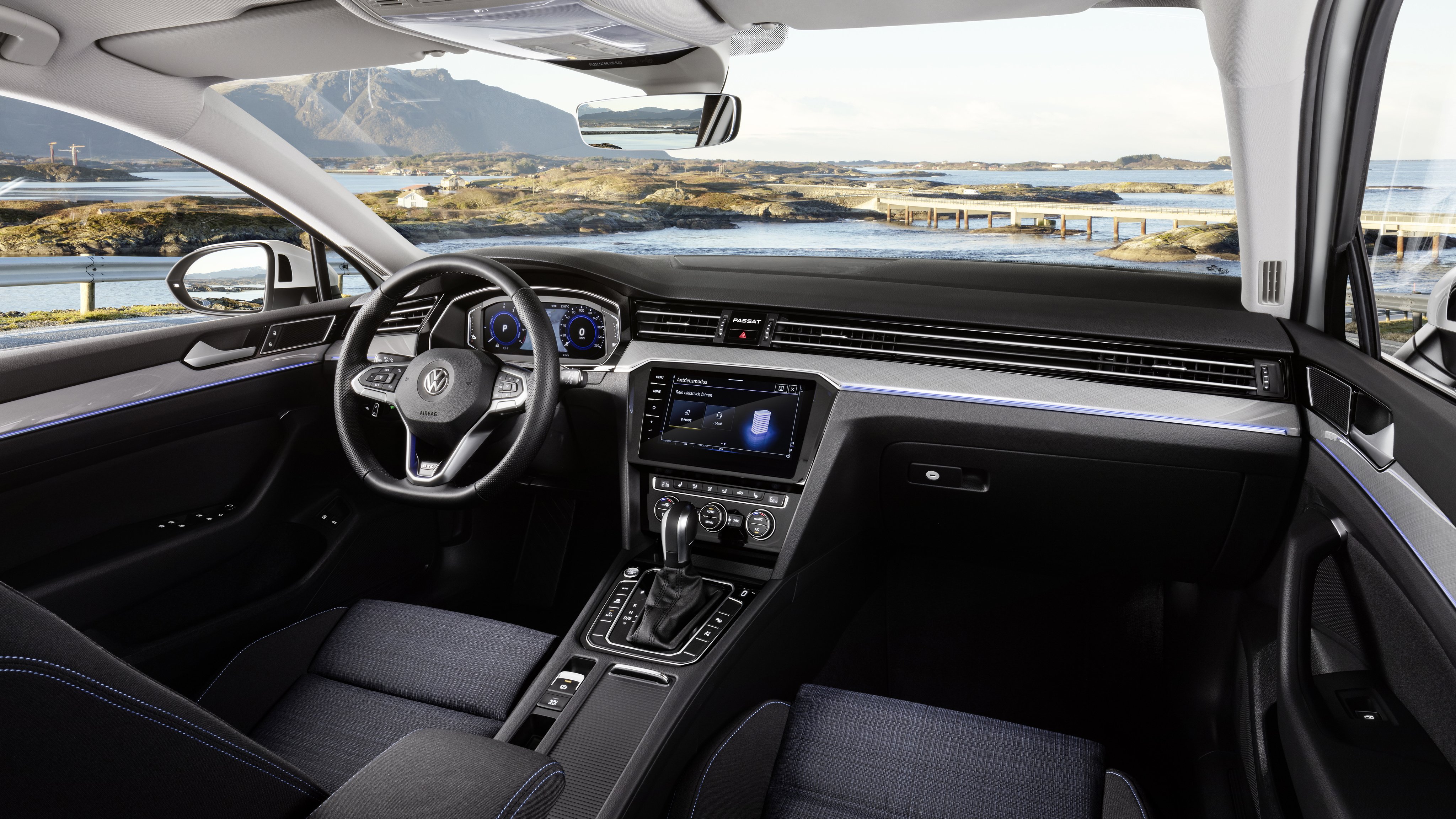 Stil som matchar den digitala världen. Invändigt utmärker sig Passat med nya klädseltyger och -mönster, ny dörrklädsel, en ny klädselfärg, nya instrument och en ny ratt. Ett bakgrundsbelyst Passat-märke har ersatt den analoga klockan på instrumentpanelen. Mittkonsolen har ett stort, öppet fack med ett induktivt gränssnitt (tillval) för smartphones. Strax intill sitter ett USB-C-uttag. Nattetid smälter displayerna för Digital Cockpit och infotainmentsystemen samman med de belysta knapparna på den beröringskänsliga multifunktionsratten och bakgrundsbelysningen – som nu kan fås i 30 färger (tillval) – till en välupplyst, elegant och funktionell informationsplattform.