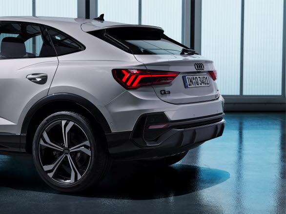 Audi Q3 Sportback står för både kraft och precision vilket återspeglas i alla designdetaljer. Den oktagonformade Singleframe-grillen har ett nytt tredimensionellt mönster och luftintag och stötfångarna är tydligt markerade. Den coupé-formade taklinjen avslutas i en takkantsspoiler och står i kontrast till den kraftfulla SUV-karaktären med kontrastlackerade detaljer. Audi Q3 Sportback upplevs därför betydligt längre än sin systermodell Audi Q3. Den är dessutom nästan tre centimeter lägre och får därmed ett mer muskulärt utseende. De markerade konturerna ovanför hjulen ger association till quattrodrivningen som är standard vid de flesta motorvalen. Bakpartiet har en helt egen karaktär med vinklad bakruta och kraftfulla stötfångare som markerar bilens bredd. Bakljusen är kilformade och återspeglar designen i de främre strålkastarna som erbjuds i tre versioner med Matrix LED som toppversion.