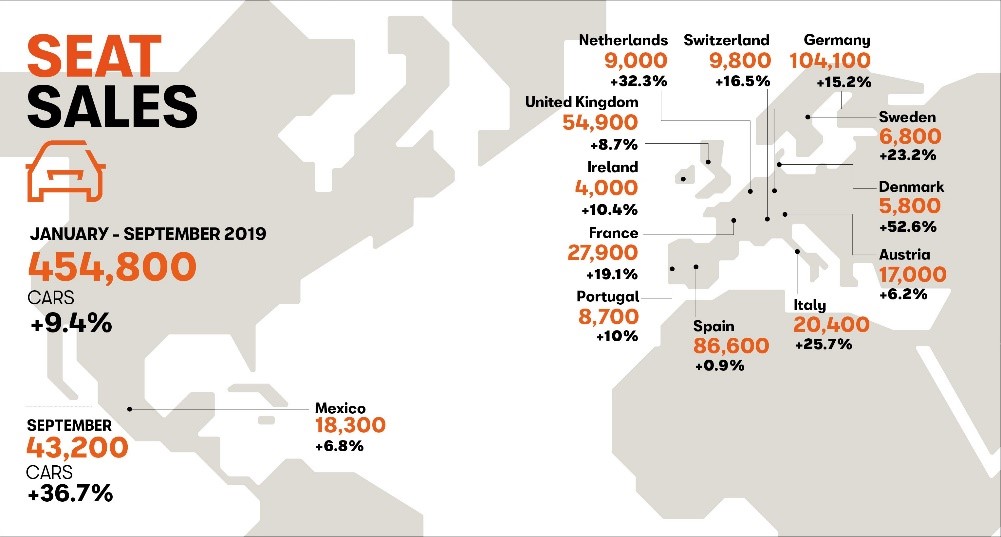 Fyra av SEATs nio viktigaste marknader noterade sina högsta försäljningsvolymer någonsin för perioden januari till september. Tyskland ligger i topp – med bara ett kvartal kvar av året har man redan passerat 100.000-strecket, en ökning med +15,2%). I Storbritannien, SEATs 3:e största marknad, ökade försäljningen med 8,7% till totalt 54.900 bilar. Österrike ligger på 6:e plats med 17.000 levererade bilar (+6,2%) och i Schweiz ökade försäljningen med 16,5% till 9.800 bilar.