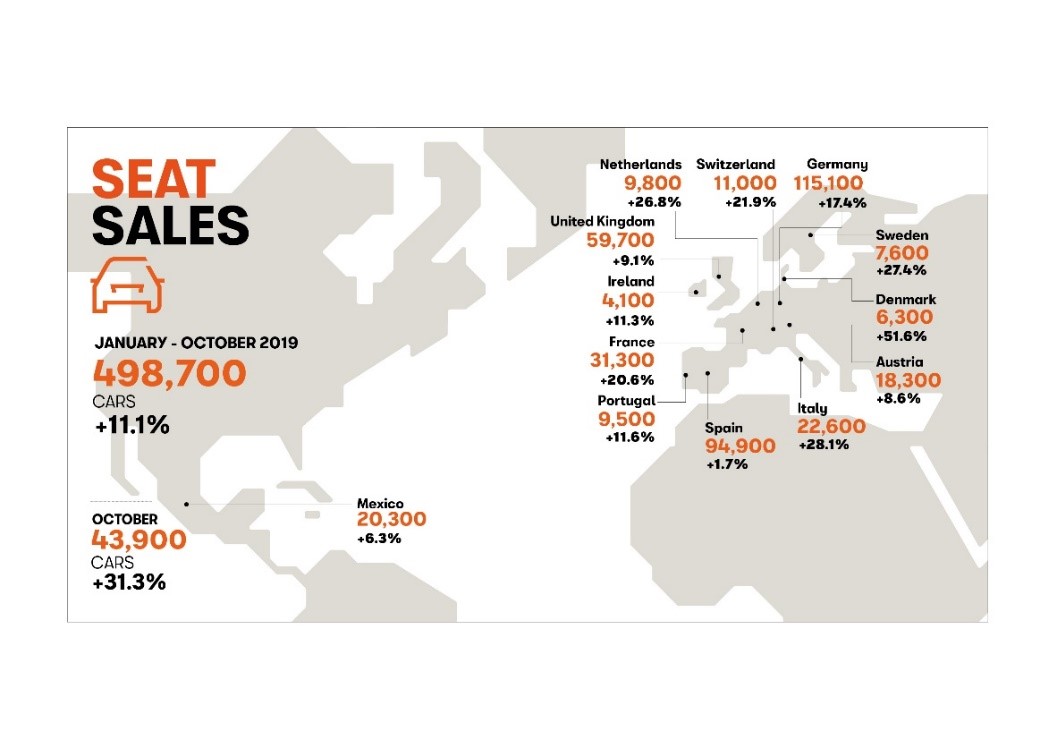 Förra månaden fortsatte den starkt stigande trenden från i september, och försäljningen steg igen över 30%-strecket. Totalt sålde företaget 43.900 bilar globalt; 31,3% fler än under oktober förra året (33.400). Ökningen kan delvis tillskrivas effekterna av att WLTP-reglerna trädde i kraft i september 2018, vilket ledde till att försäljningskurvan böjde av starkt uppåt under juli och augusti, för att sedan sjunka igen under de närmaste månaderna. Det här var den bästa oktobermånaden i SEAT:s historia, det tidigare oktoberrekordet sattes 2017 (40.200 sålda bilar).