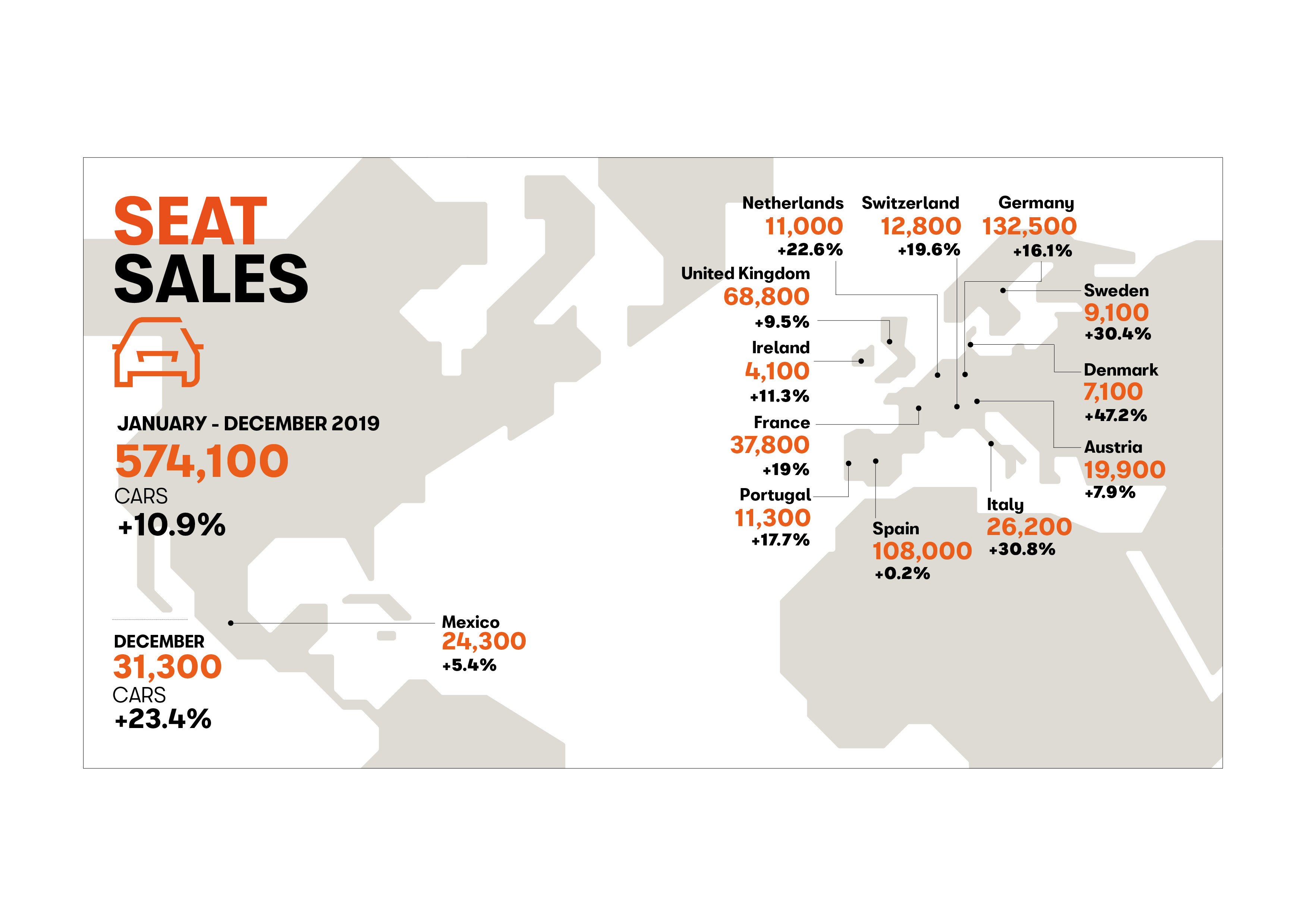 I december månad ökade SEAT sin försäljning med 23,4%, jämfört med samma månad 2018, till totalt 31.300 levererade bilar (2018: 25.300).