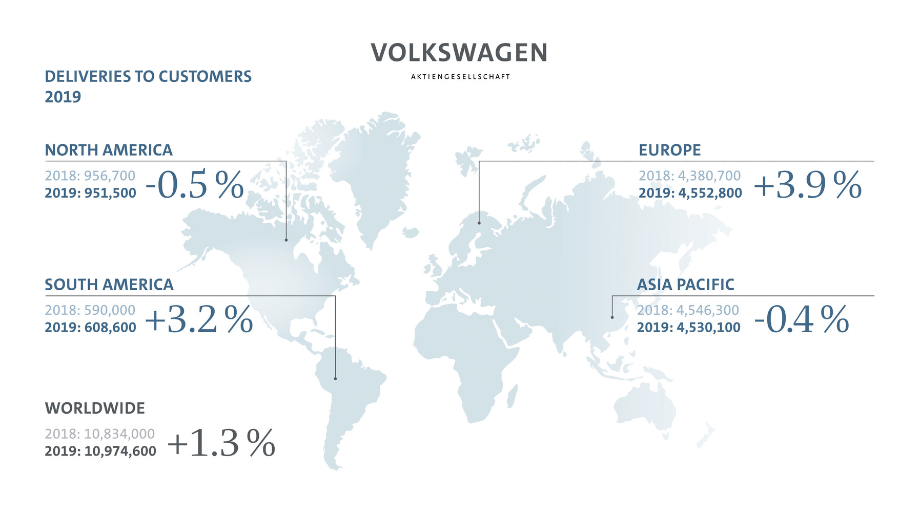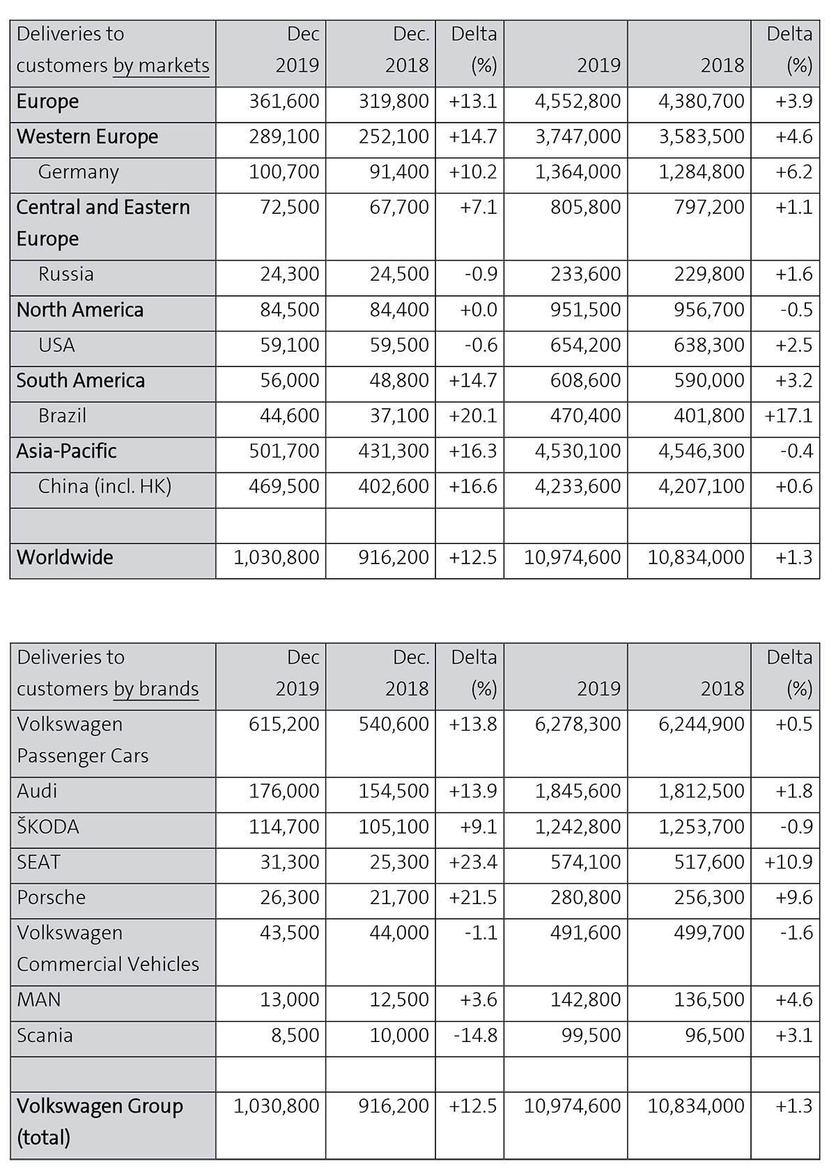 Trots att de totala marknaderna minskade ökade Volkswagen-koncernen sina leveranser över hela världen med 1,3 % till rekordhöga 10 974 600 bilar under 2019. Marknadsandelarna ökade i alla regioner, i vissa fall betydligt. Volymtillväxt uppnåddes i Europa (+3,9 %) och Sydamerika (+3,2 %) medan den föll något i Nordamerika (-0,5 %) och Asien-Stillahavsområdet (-0,4 %). Stark tillväxt registrerades för elbilar med cirka 80 % till mer än 140 000 fordon, som ett resultat av många nya modeller inom koncernens eloffensiv och ett växande intresse från kunderna.