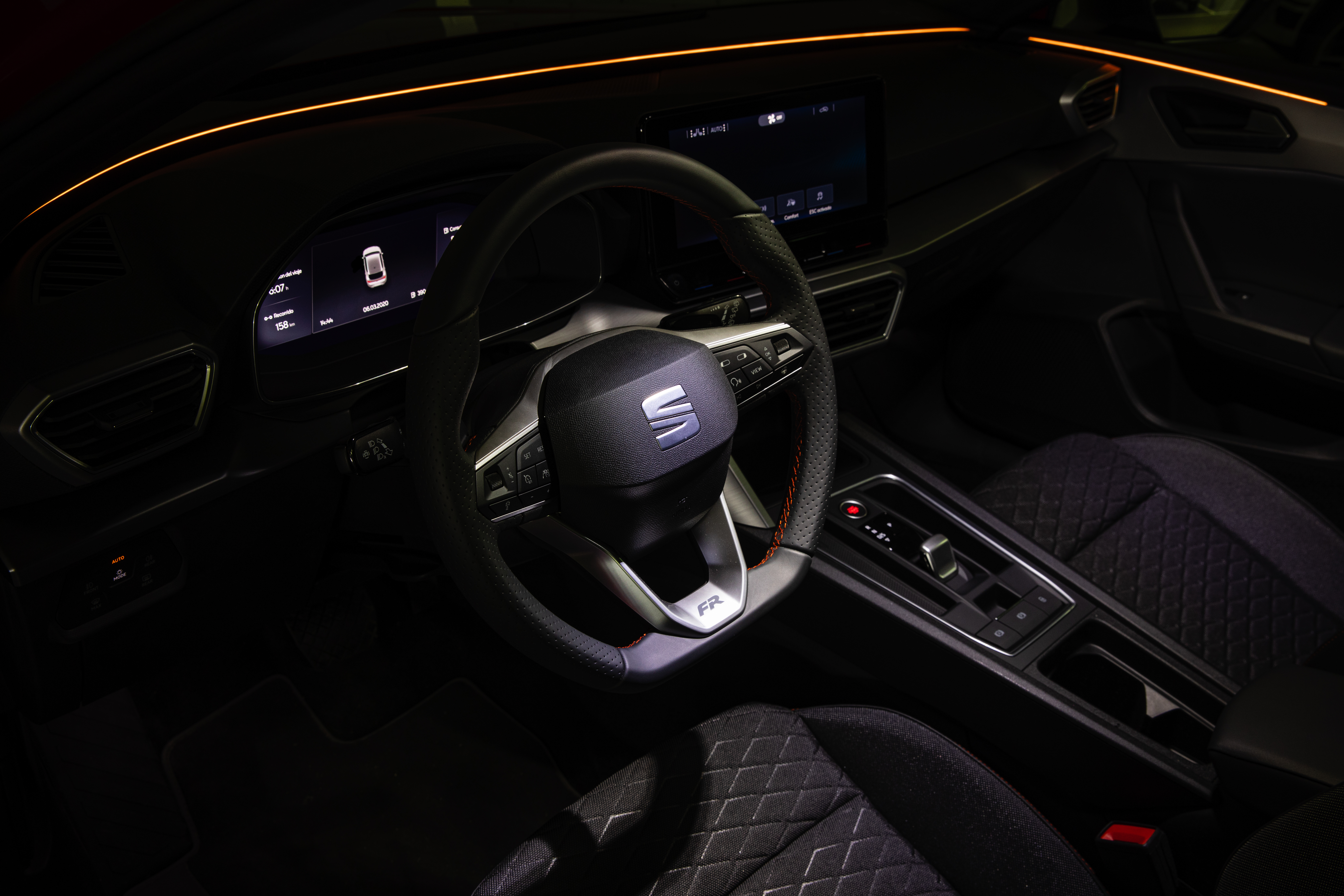 Omslutande ljus. Om LED-strålkastarna och coast-to-coast bakljusen exteriört signalerar det stora designklivet för nya Leon, understryker den interiöra stämningsbelysningen också modellens omfattande transformation. Belysningen sträcker sig över hela instrumentbrädan och fortsätter längs med dörrarna, vilket ökar känslan av ett omslutande ljus. Dessutom är det inte bara dekorativt. "Det har också ett antal enastående funktioner, exempelvis uppmärksammar innerbelysningen dig om en motorcykel snabbt närmar sig bakifrån." förklarar David.