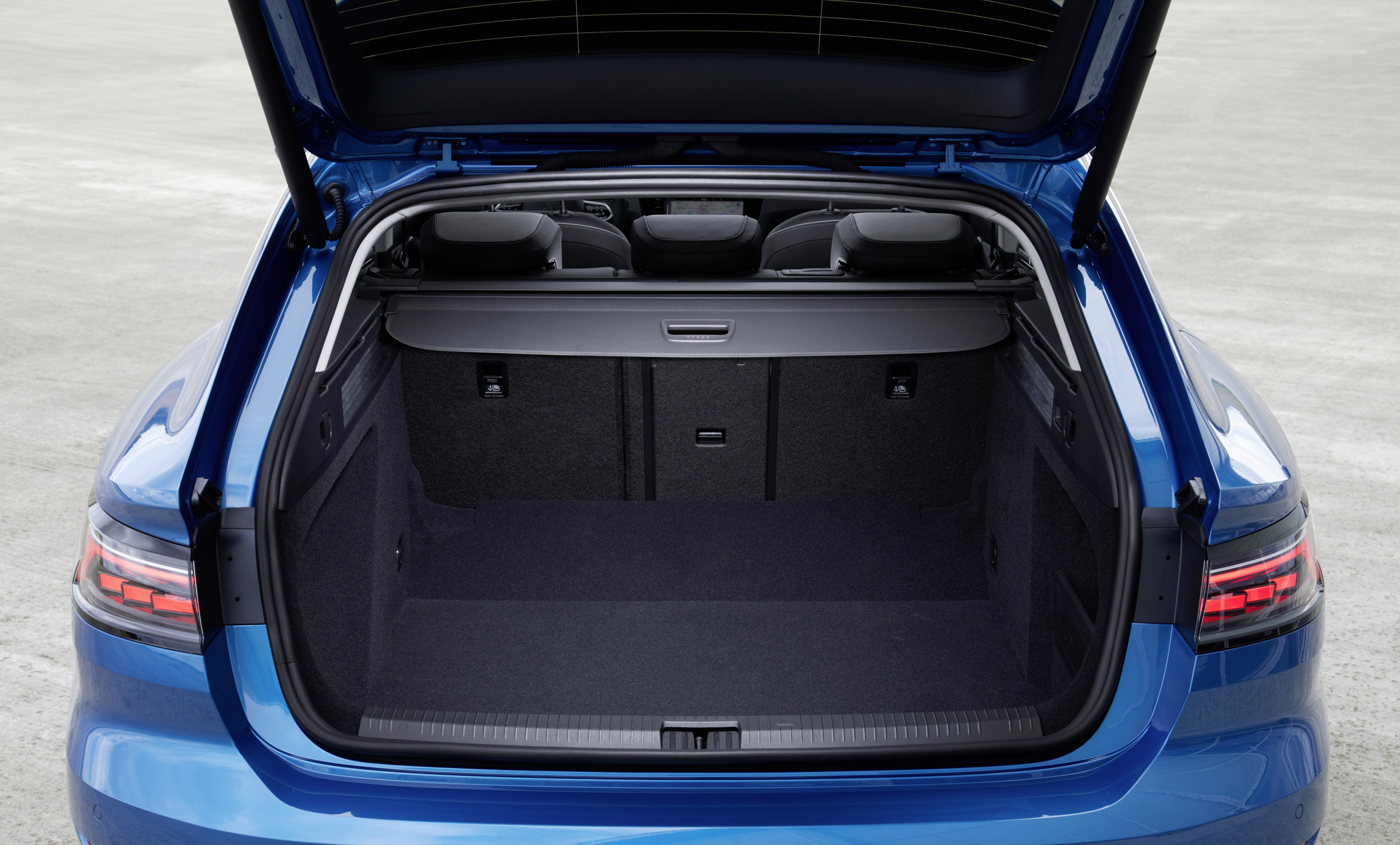 Lastvolym: upp till 1 632 liter. Öppna bakluckan på Arteon Shooting Brake och du får tillgång till ett lastutrymme på 565 liter om du lastar upp till insynsskyddet (fastbackversionen: 563 liter). Lastar du upp till taket och hela vägen till framsätena står ett utrymme på 1 632 liter. (fastback: 1 557 liter) till ditt förfogande. I bägge fallen är lastutrymmet 2 092 mm långt (räknat fram till framsätena).