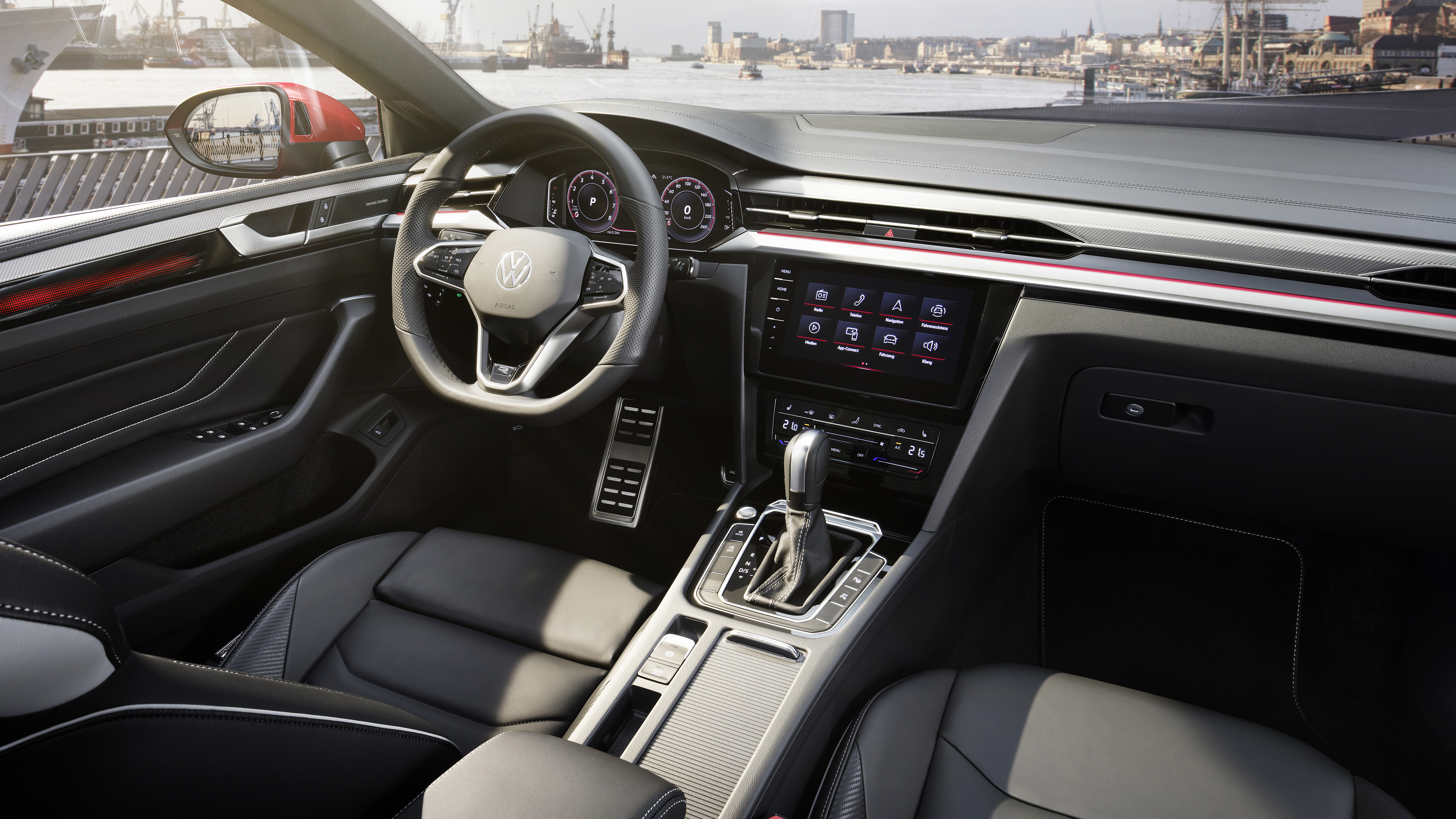 Ny förarmiljö. Invändigt har modellserien fått en uppdaterad förarmiljö som anpassats efter Arteons karisma och exklusiva karaktär. Handhavandet i bilen underlättas bland annat av praktiska skjutreglage för den automatiska luftkonditioneringen och en ny multifunktionsratt med beröringskänsliga reglage. En annan nyhet är integreringen av apparna ”App-Connect Wireless” för ”Apple CarPlay” och ”Android Auto” (Google), och ett både förstklassigt och ljudstarkt ljudsystem på 700 Watt från HiFi-experterna harman/kardon (tillval), speciellt framtaget för Arteon och Arteon Shooting Brake. Ett annat tillval är en bakgrundsbelysning med 30 färger som alltid kan ge rätt stämning i kupén. Här är instrumentpanelen och dörrarna upplysta – ljus istället för krom.