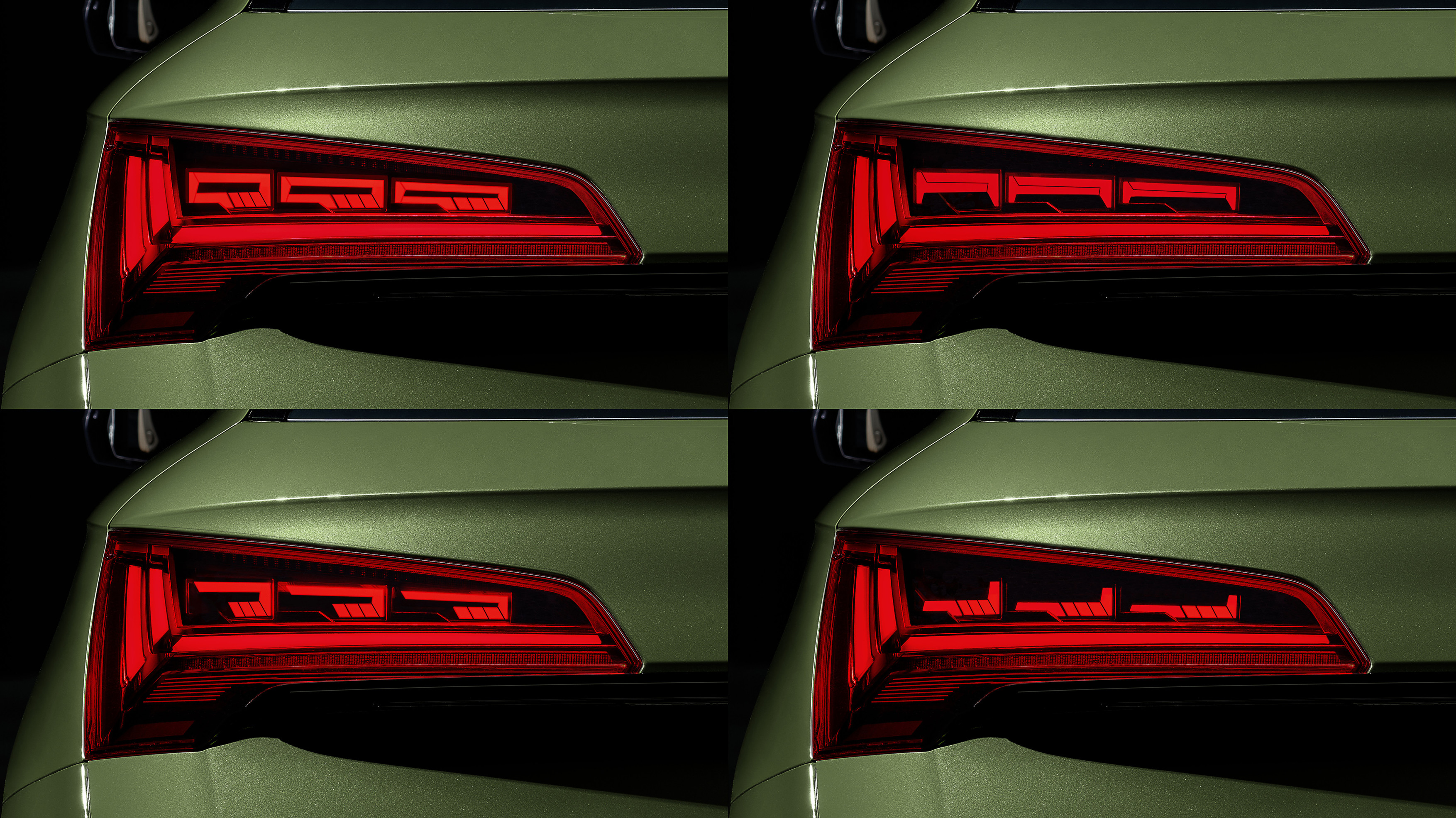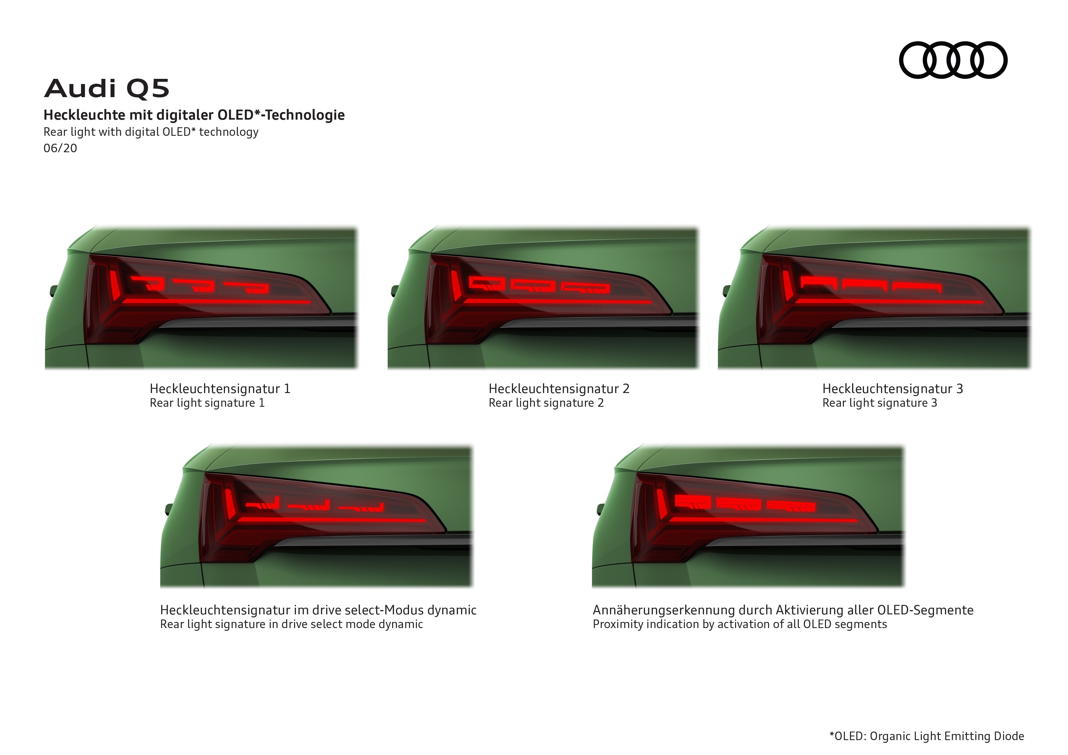 Det stora antalet individuellt reglerbara segmenten kan nu aktiveras efter önskemål med steglös ljusstyrka. I Audi Q5 används tre plattor med sex enheter vardera, dvs 18 segment per bakljus. Den höga precisionen och stora flexibiliteten ger en ljusdesigner stora möjligheter, trots att hårdvaran är densamma. Q5-kunder som väljer till digital OLED-teknik kan välja mellan tre olika bakljussignaturer när de köper sin bil. Dessutom tillkommer ytterligare en speciell signatur när “dynamic–läget” aktiveras i Audi drive select. OLED ger också utrymme för animationseffekter som coming-home/leaving-home samt dynamiskt blinkersljus som integreras i bakljuset.