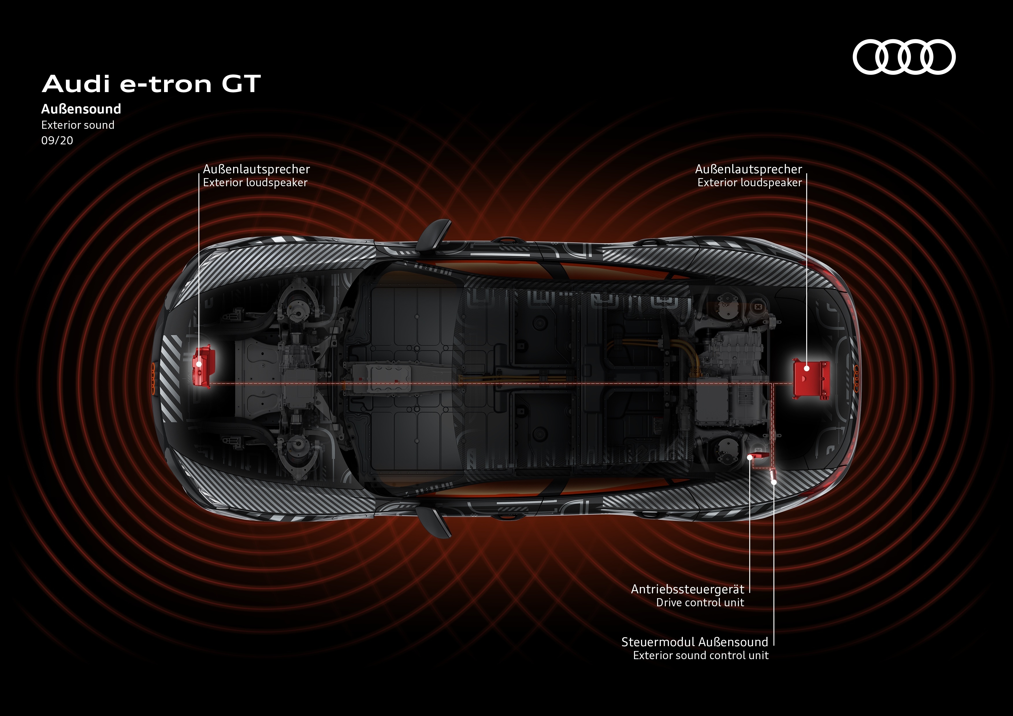 Köper man en Audi e-tron GT kan man själv bestämma om och hur man vill höra Audi e-sound. I standardutrustningen ingår lagstadgat varningsljud i låga hastigheter (”AVAS”: Acoustic Vehicle Alerting System). Ljudet kommer från en högtalare placerad i bilens front. I låga hastigheter (från 20 km/h  i EU och från 32 km/h  i Nordamerika) – blir det gradvis svagare ju fortare man kör och tystnar helt när man kommit upp i 60 km/h. Även i standardversionen ingår de lagstadgade ljudkomponenterna i en ljudpalett som är bredare än vad lagen kräver.