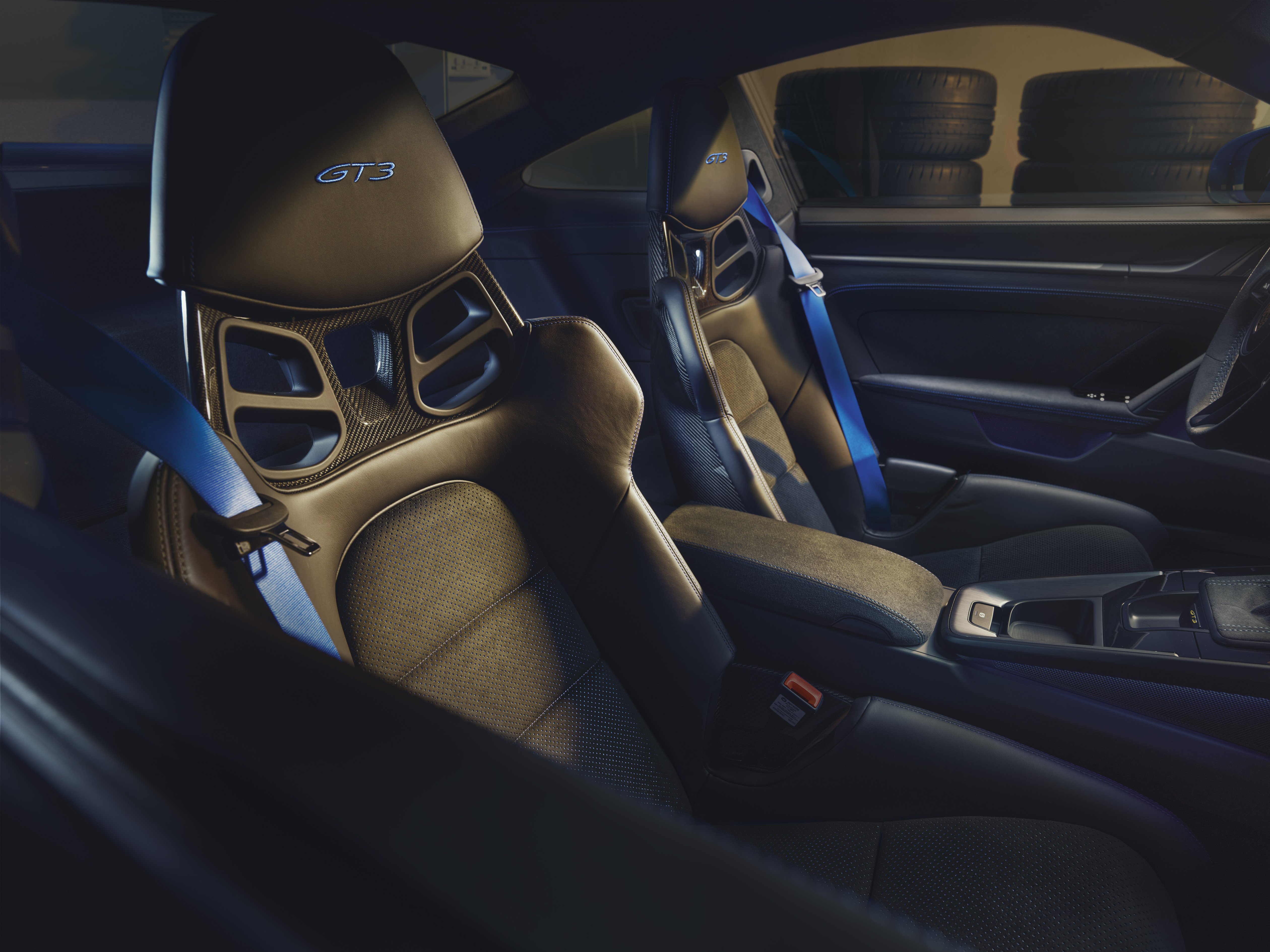 Racinggenerna framgår i nästan alla detaljer i nya 911 GT3. Förarplatsen överensstämmer med den i den nuvarande modellgenerationen. En nyhet är en track screen: med ett knapptryck reduceras informationen på de digitala skärmarna till vänster och till höger om den centralt placerade varvräknaren, graderad till 10 000 v/min, för att istället informera om däcktryck, oljetryck, oljetemperatur, bränslenivå och kylvattentemperatur, viktiga uppgifter vid bankörning. Skärmen visar också en växlingsassistans med färgade staplar till vänster och höger om varvräknaren och en shift light (växlingsindikator) från Motorsport.
