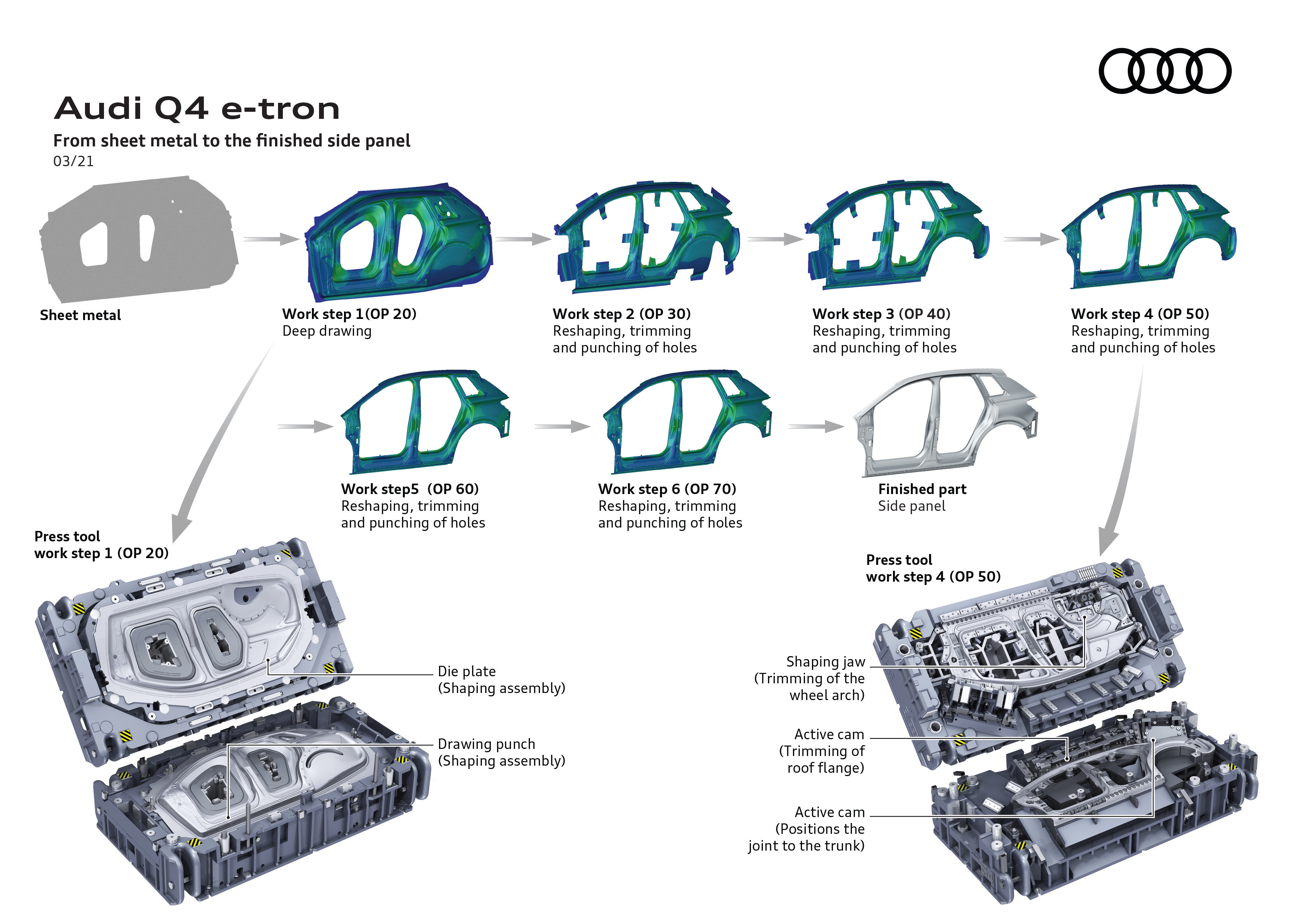 Med produktionen igång i Zwickau behöver pressverket totalt sex produktionssteg för att utforma sidoplåtarna, var och ett med ett speciellt verktyg. Det första stansar plåten till önskad form och i de följande sker utsnitten med skarpa fina kanter och linjer och utformningen av det komplicerade ramverket på insidan som är nödvändigt för sammansättningen av karossen. Efter varje steg formas plåten igen för att säkerställa att den behåller sin ursprungsform genom hela processen. Det som börjar som ett plant plåtstycke når sin tredimensionella och emotionella design med högsta precision.