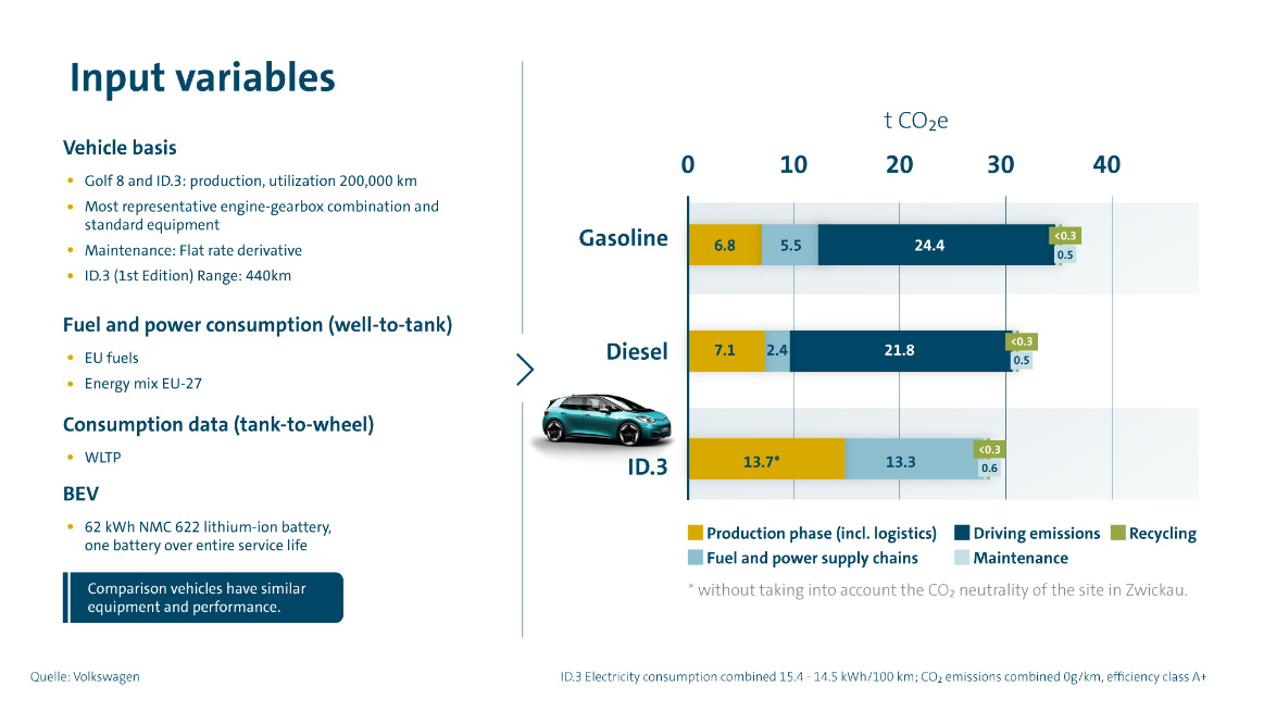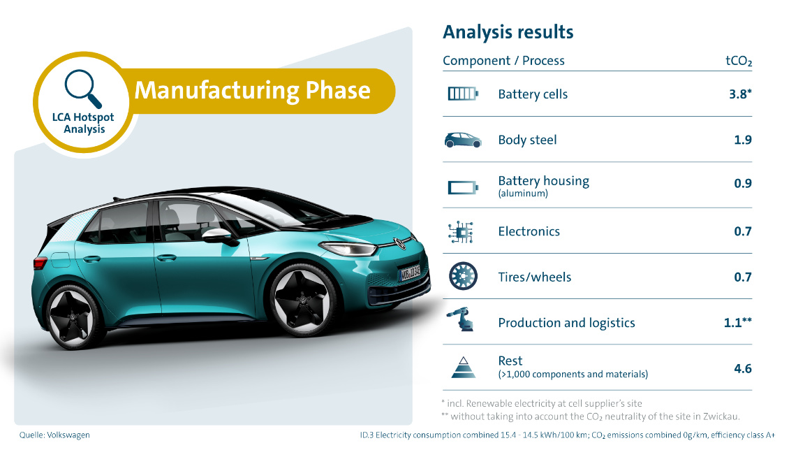 Figur 1 (se bifogad bild) visar att produktionen av elbilar för närvarande orsakar betydligt högre CO2-utsläpp än produktionen av konventionella bilar. Tillverkningsfasen innefattar alla CO2-utsläpp i värdekedjan ”Cradle-to-gate”, alltså från och med utvinningen av råmaterial, via tillverkningen av halvfabrikat och komponenter, till och med produktionen i Volkswagens fabriker. Trots de högre utsläppen i tillverkningsfasen, svarar elbilen sedan för betydande besparingar under en livstid som beräknats på 200 000 km, och vid en genomsnittlig europeisk elmix, jämfört med diesel- och bensindrivna bilar.