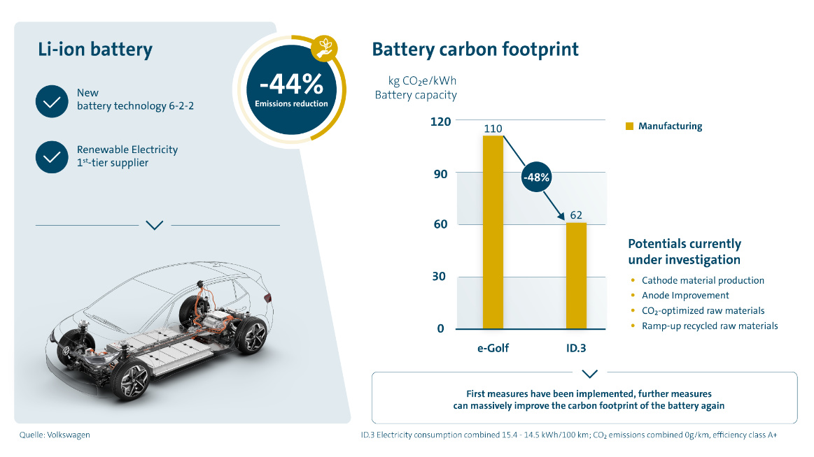 Jämfört med det batteri som sitter i e-Golf är den nya generation batterier som används i ID.3 ett enormt framsteg. Med det nya katodmaterialet (6-2-2) har batterikapaciteten kunnat höjas – med bibehållen materialkostnad – jämfört med den förra generationen (1-1-1). Samtidigt avtalade Volkswagen med sin battericellsleverantör om att de enbart skulle använda elektricitet producerad av förnybara energikällor. Dessa båda åtgärder svarar för en sänkning av det specifika koldioxidavtrycket från 110 kg CO2/kWh till endast 62 kg CO2/kWh (se Figur 3, bifogad bild).