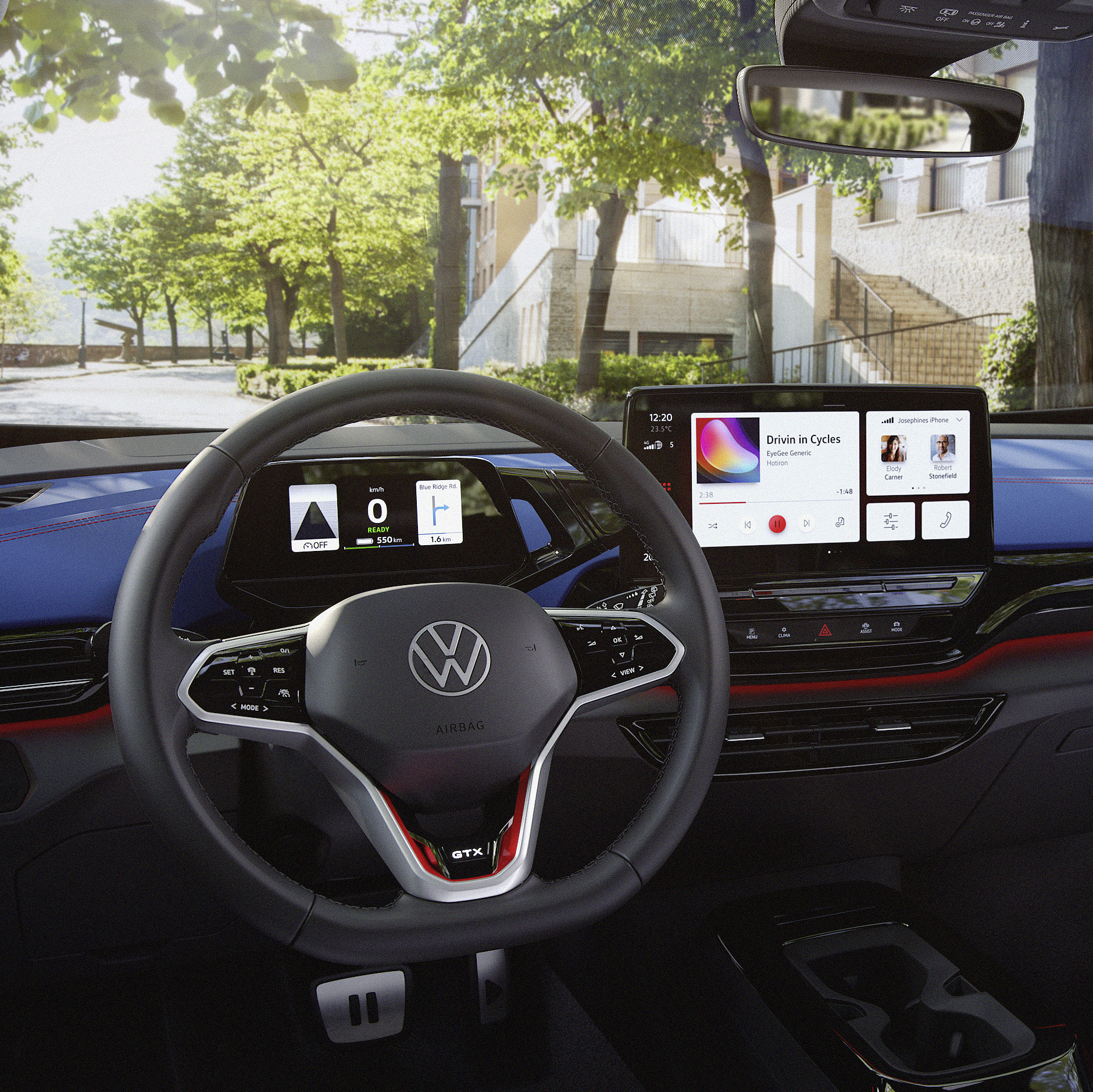 Manöverkoncept med dubbla displayer. Manöverkonceptet i ID.4 GTX är lika smidigt som det är intuitivt. Instrumentpanelen är helt fri från fysiska knappar och reglage vilket ger den en ren och hypermodern look. Via multifunktionsratten kan föraren också styra en kompakt 5,3"-display som visar den viktigaste informationen. En stor digital vippströmbrytare vid kanten på displayens högra sida används för att välja körläge. Mitt på instrumentpanelen sitter en pekskärm för navigationssystemet, telefonfunktionerna, media och olika assistanssystem och fordonsinställningar. 10"-display är standard – väljer man Infotainment Plus-paketet mäter displayen hela 12" på diagonalen. Den standardmonterade röststyrningsfunktionen ”Hej ID.” – som även förstår många vanliga vardagsfraser – sitter på den andra nivån. Tack vare sin internetuppkoppling, har Hej ID. tillgång till information lagrad i molnet.