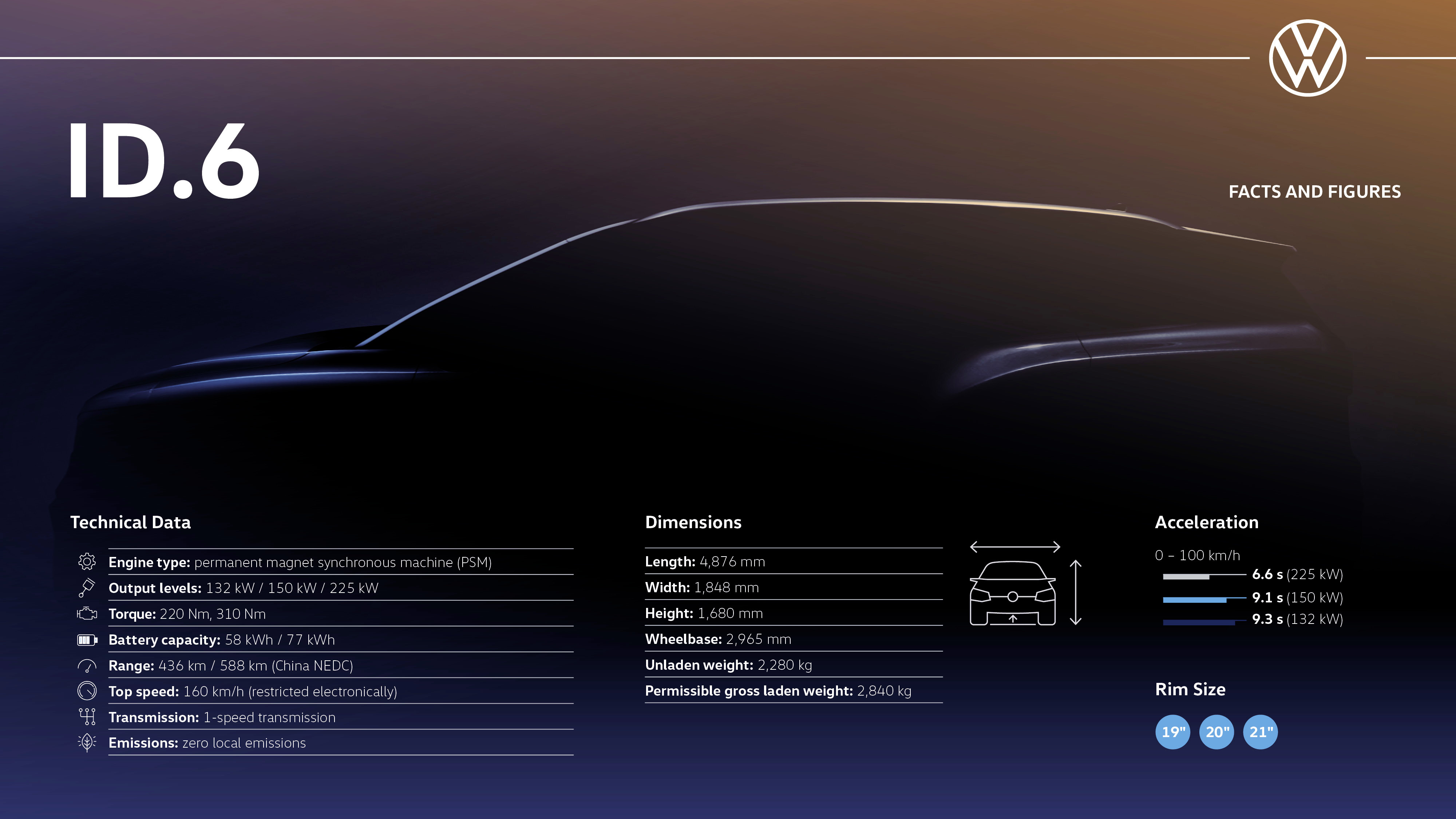 Volkswagen närmar sig de framtidsinriktade ämnena digitalisering, nya affärsmodeller och autonom körning med beslutsamhet. Efter kompakta ID.3 och SUV:en ID.4 är ID.6 den tredje helelektriska modellen i ID.-familjen. ID.6 kommer att produceras i de två fabrikerna Anting och Foshang i Kina och kommer endast att finnas på den kinesiska marknaden i dessa två versioner.