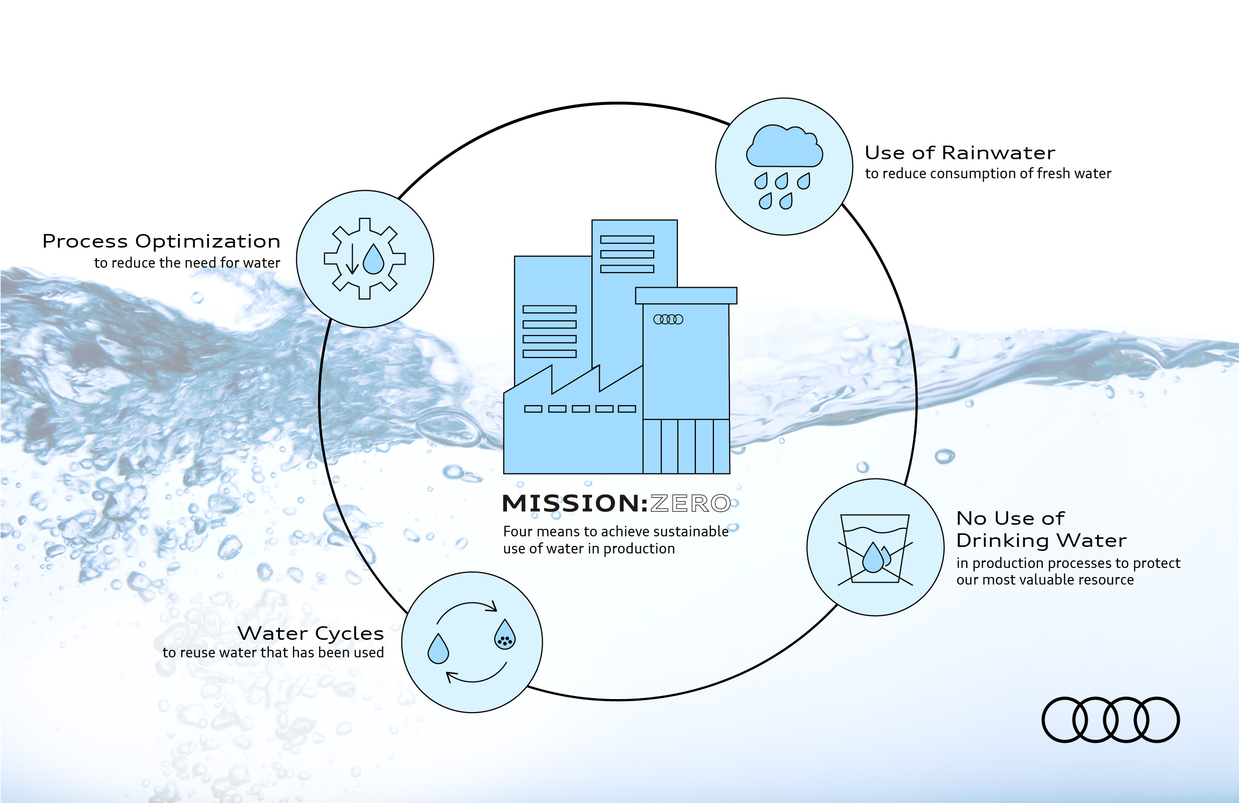 För att använda vatten medvetet och sparsamt fokuserar Audi även på att effektivisera processer genom cirkulära vattenkretslopp och ökad användning av regnvatten. Peter Kössler, som är produktions- och logistikdirektör i Audis ledningsgrupp säger, “Vi vill minska vår färskvattenförbrukning kraftigt och sänka vår vattenkonsumtion per tillverkad bil till hälften till 2035. För att göra det använder vi redan återvunnet vatten, som används upprepade gånger och i kretsloppen varhelst det är möjligt. Vår vision är att ha cirkulära vattenkretslopp vid alla våra produktionsanläggningar.