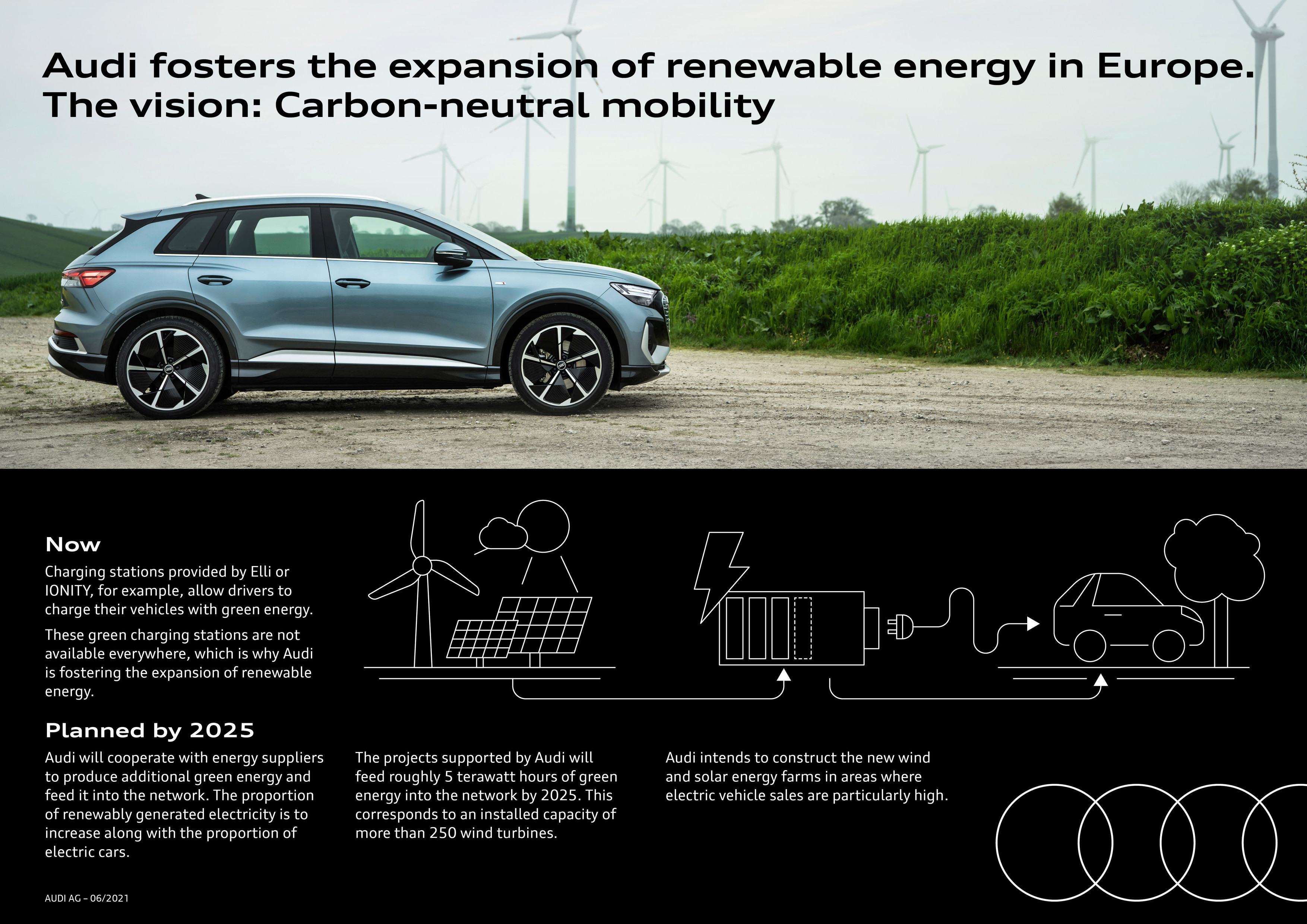 Målet är att öka andelen förnybar el från samarbetspartners samtidigt som andelen elbilar ökar på vägarna. “Det betyder att hela vår e-tron flotta i Europa kommer att köras klimatneutralt i framtiden,” säger Oliver Hoffmann. Det första projektet, en solcellspark i tyska Mecklenburg-Vorpommern, utvecklas i samarbete med det tyska energiföretaget RWE. Anläggningen går i drift 2022 och är planerad för en total kapacitet på 170 miljoner kilowattimmar. Med närmare 420,000 solpaneler kommer det att bli en av de största oberoende solcellsparkerna i Tyskland. Fler projekt kommer att följa inom kort.