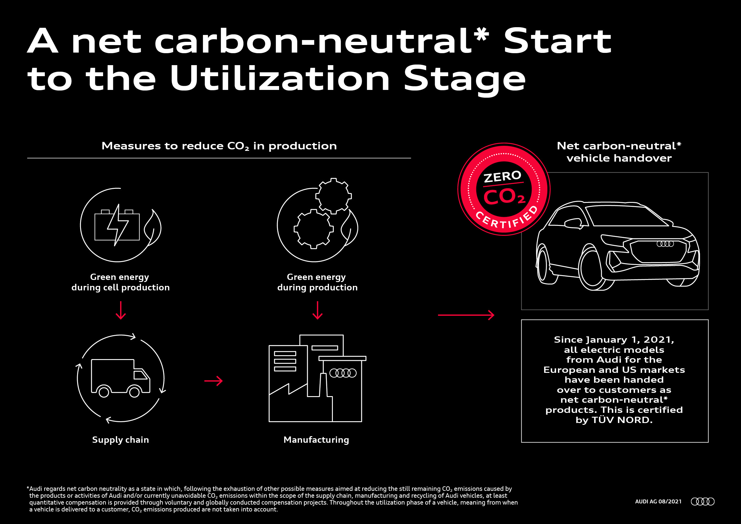 Resultatet av alla dessa steg och koncept är tydligt: produktionen av Audi e-tron GT, Audi e-tron, Audi e-tron Sportback, och Q4 e-tron serien och leveranserna till kunder är redan koldioxidneutral. Det utsläpp av koldioxid som inte kan undvikas under produktionen och logistiken kompenseras dessutom genom koldioxidkrediter som är certifierade antingen via de icke vinstdrivande organisationerna The Gold Standard eller Verified Carbon Standard. Det innebär att alla elbilar för den europeiska och amerikanska marknaden har levererats till kunder som koldioxidnetruala produkter sedan 1/1/2021. Det är certifierat via TÜV Nord.