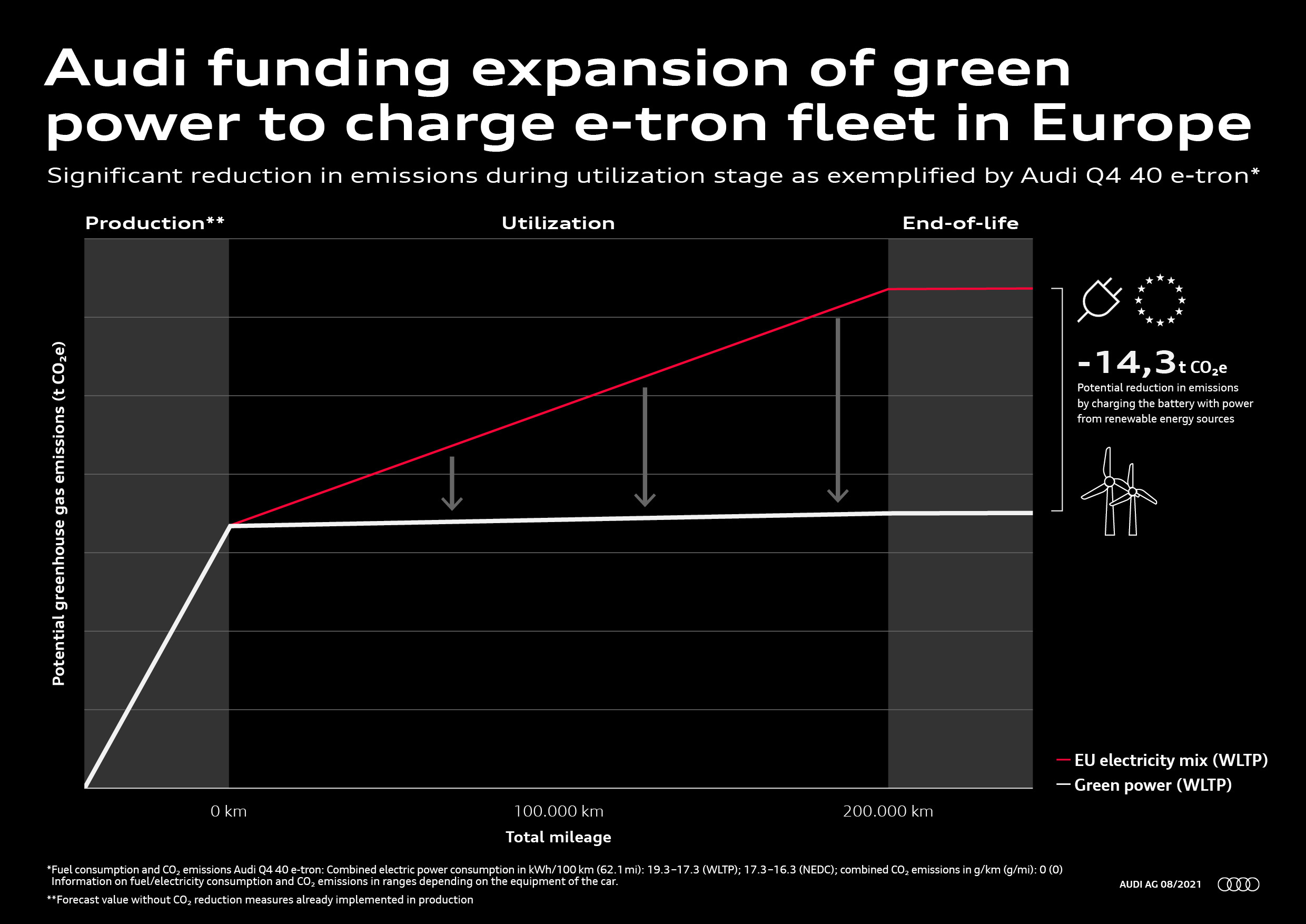 Det mesta av utsläppen i bilens livscykel sker i nyttjandefasen, dvs när den används av kunderna. För elbilar är det därför avgörande vilken el som används. Fortfarande saknas det dock förnybar el i många länder. Audi samarbetar därför med energileverantörer och utvecklar sitt eget laddkoncept. “Vi vill erbjuda våra kunder en helhetslösning för elbilsupplevelsen. Utöver attraktiva modeller behöver vi kunna erbjuda ett heltäckande utbud av grön el,” säger Oliver Hoffman, utvecklingschef i Audis ledningsgrupp. Audi-kunder kan till exempel redan välja förnybar el via Elli (Electric Life), dotterbolag till Volkswagen, för att ladda bilarna hemma. Längs vägarna finns IONITY och många andra laddoperatörer med grön el.