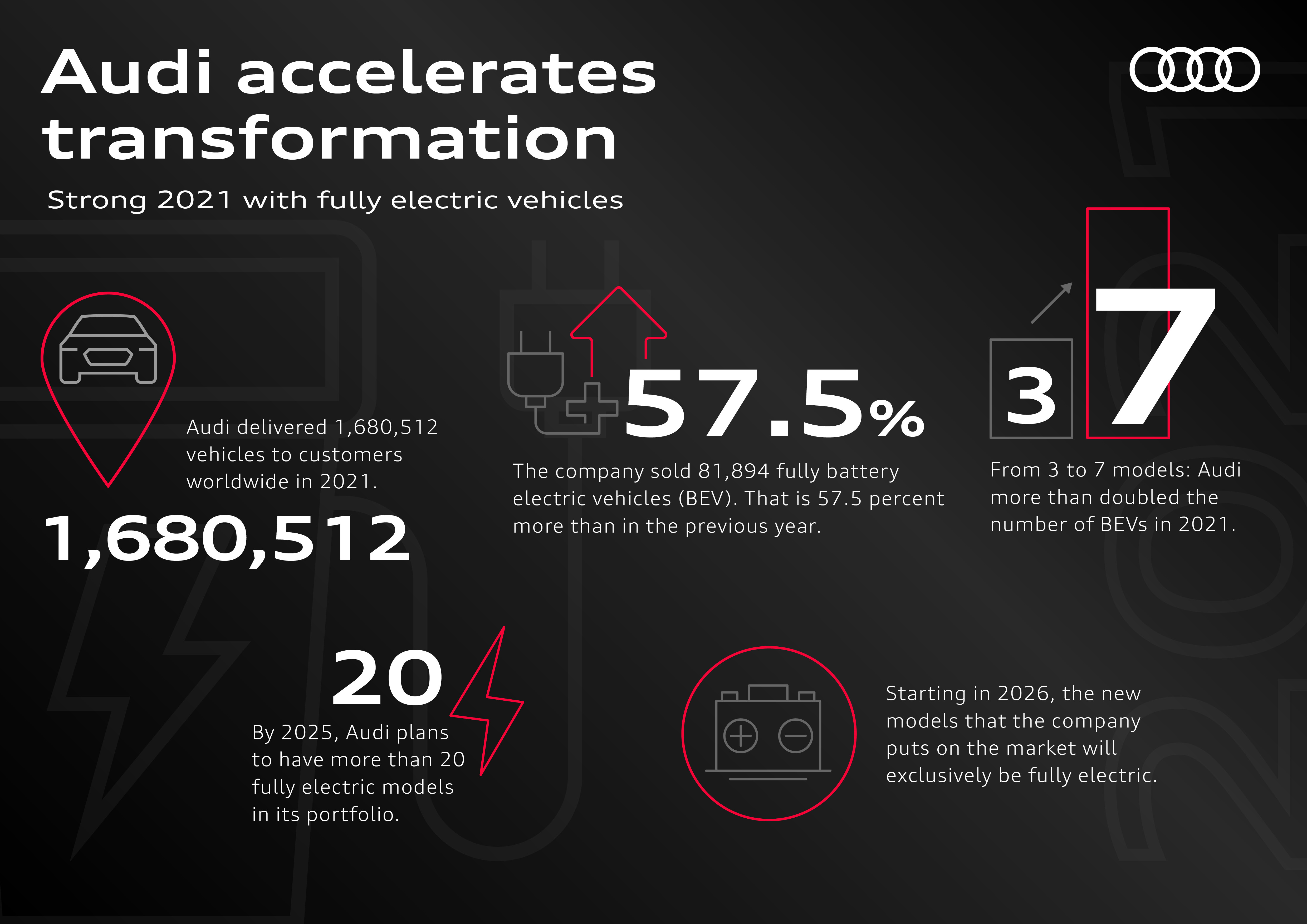 Trots den globala bristen på halvledare håller Audi ett högt tempo på vägen mot hållbar premiummobilitet. Under 2021 ökade leveranserna av helt eldrivna bilar med hela 57,5 procent jämfört med året innan. Audi mer än fördubblade dessutom sin produktportfölj med elbilar under det gångna året. Trots den utmanande situationen levererade Audi nästan samma totalvolym som året innan. 2021 registrerades 1.680.512 bilar, vilket var 0,7% färre än 2020. I USA överträffades fjolårsresultatet med 5 procent.