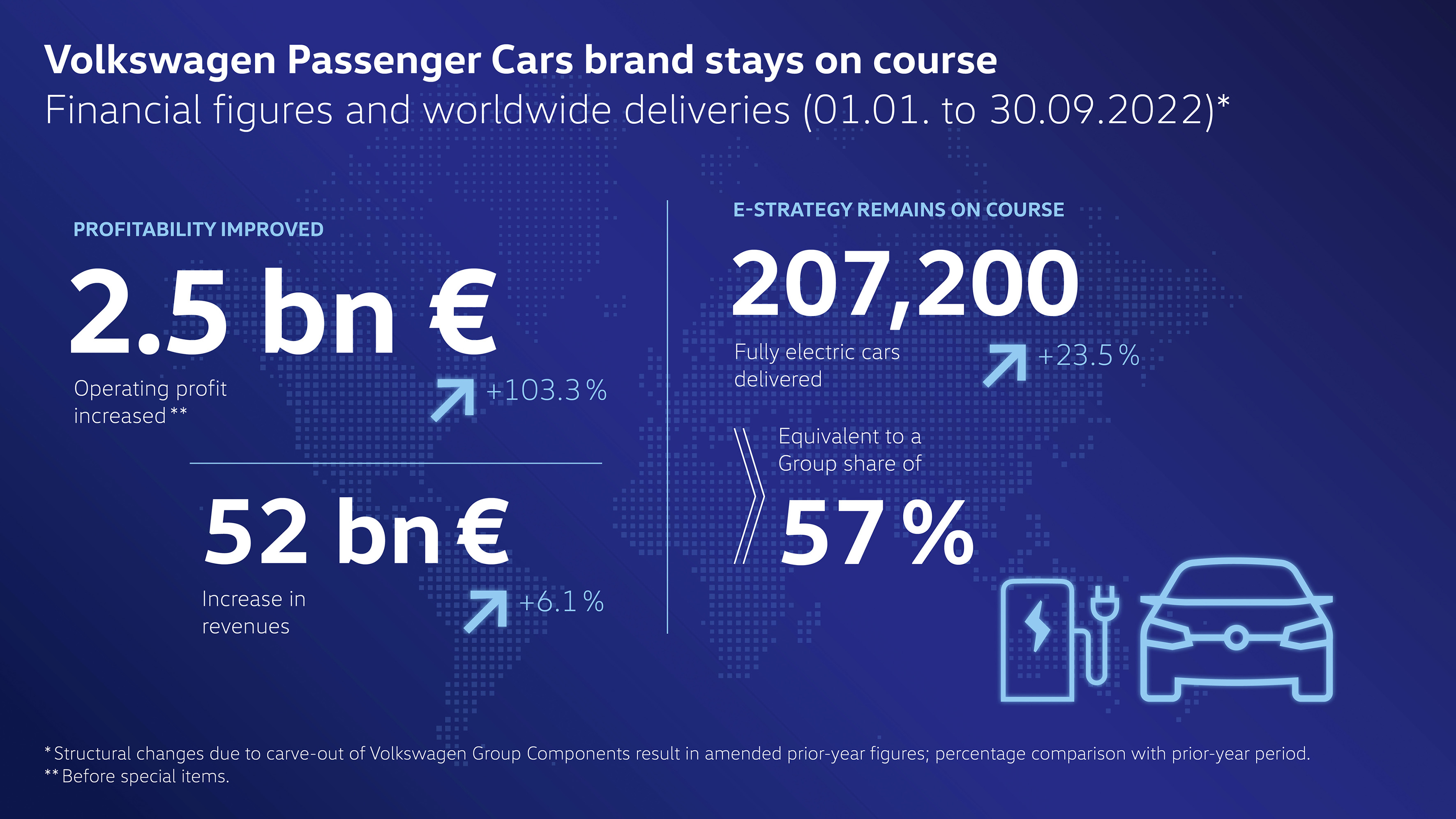 Även om många kundorder inte kunde levereras som planerat på grund av den ihållande bristen på komponenter, förstärktes resultatet av en positiv modellmix och en återhämtning i leveransvolymerna under tredje kvartalet. 1,26 miljoner levererade Volkswagen personbilar över hela världen mellan juli och september 2022 var en ökning med 15,3 procent jämfört med samma kvartal föregående år.