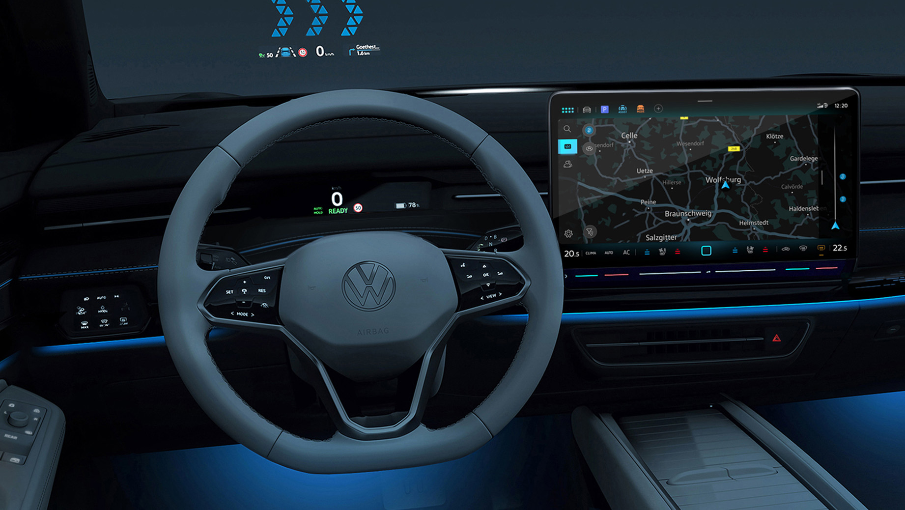 Om det finns passagerare i bilen kan luften riktas direkt mot kroppen eller ventilera kupén indirekt. Dessa funktioner visas alltid på den nya stora displayen och kan aktiveras och sparas individuellt för varje användare. Speciella önskemål kan aktiveras med röstkommandon. Om användaren säger ”Hej Volkswagen, mina händer är kalla!”, svarar ID.7 genom att starta rattvärmefunktionen. Samtidigt riktas varm luft mot händerna.