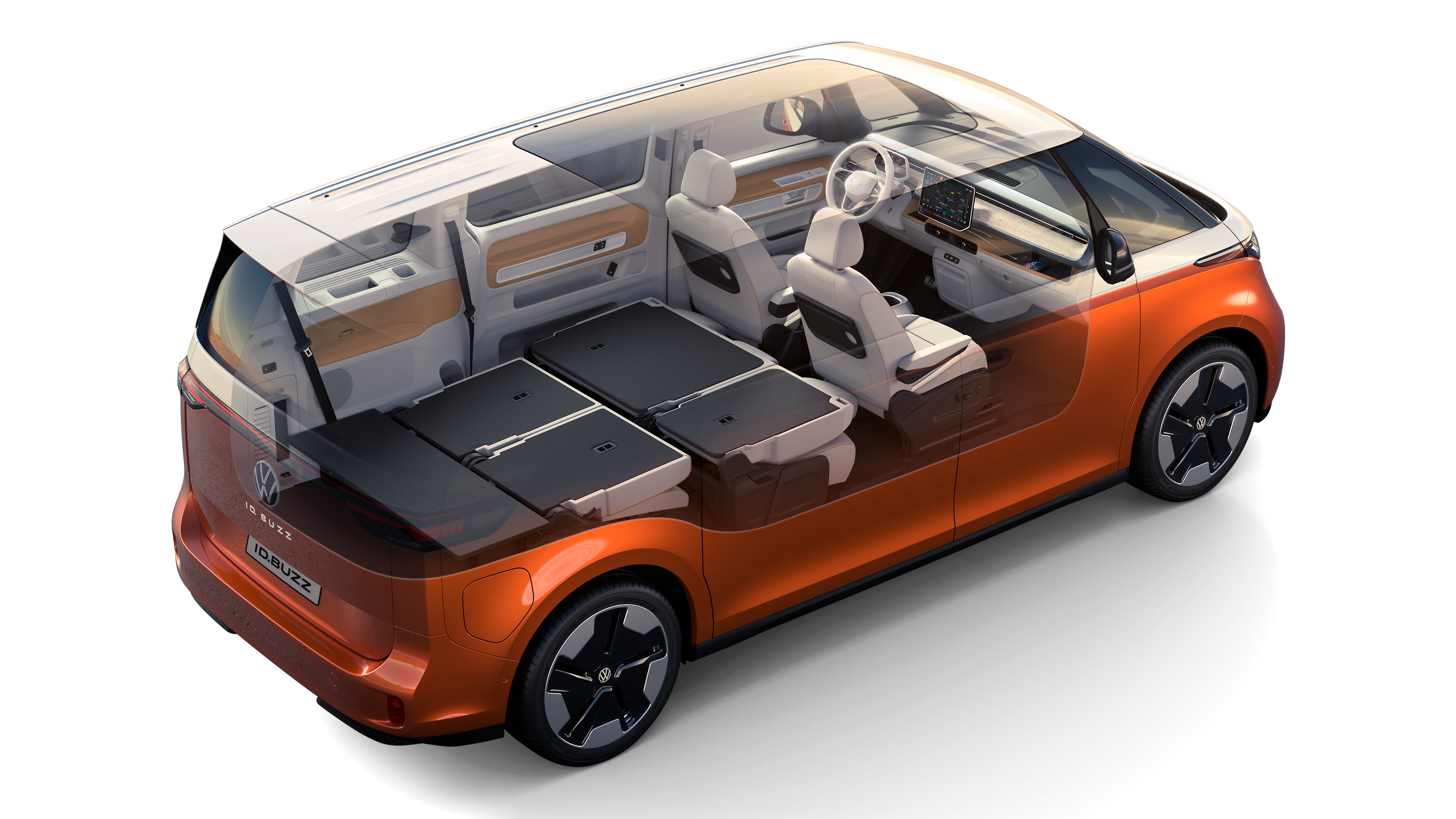 Ett bagageutrymme för cyklar och brädor. Nya ID. Buzz med förlängd hjulbas erbjuder ett bagageutrymme i typisk VW Buss-klass. I den femsitsiga konfigurationen ges en lastvolym, upp till ryggstödens övre kant, på 1 340 liter (NWB: 1 121 liter). Om sätet på andra raden fälls i den långa ID. Buzz ökar volymen till upp till 2 469 liter. Detta förvandlar bagageutrymmet till ett lastutrymme för skärmflygare, cyklister och surfare. Även när den är upptagen av sju personer har bagaget i långa ID. Buzz fortfarande en volym på 306 liter.