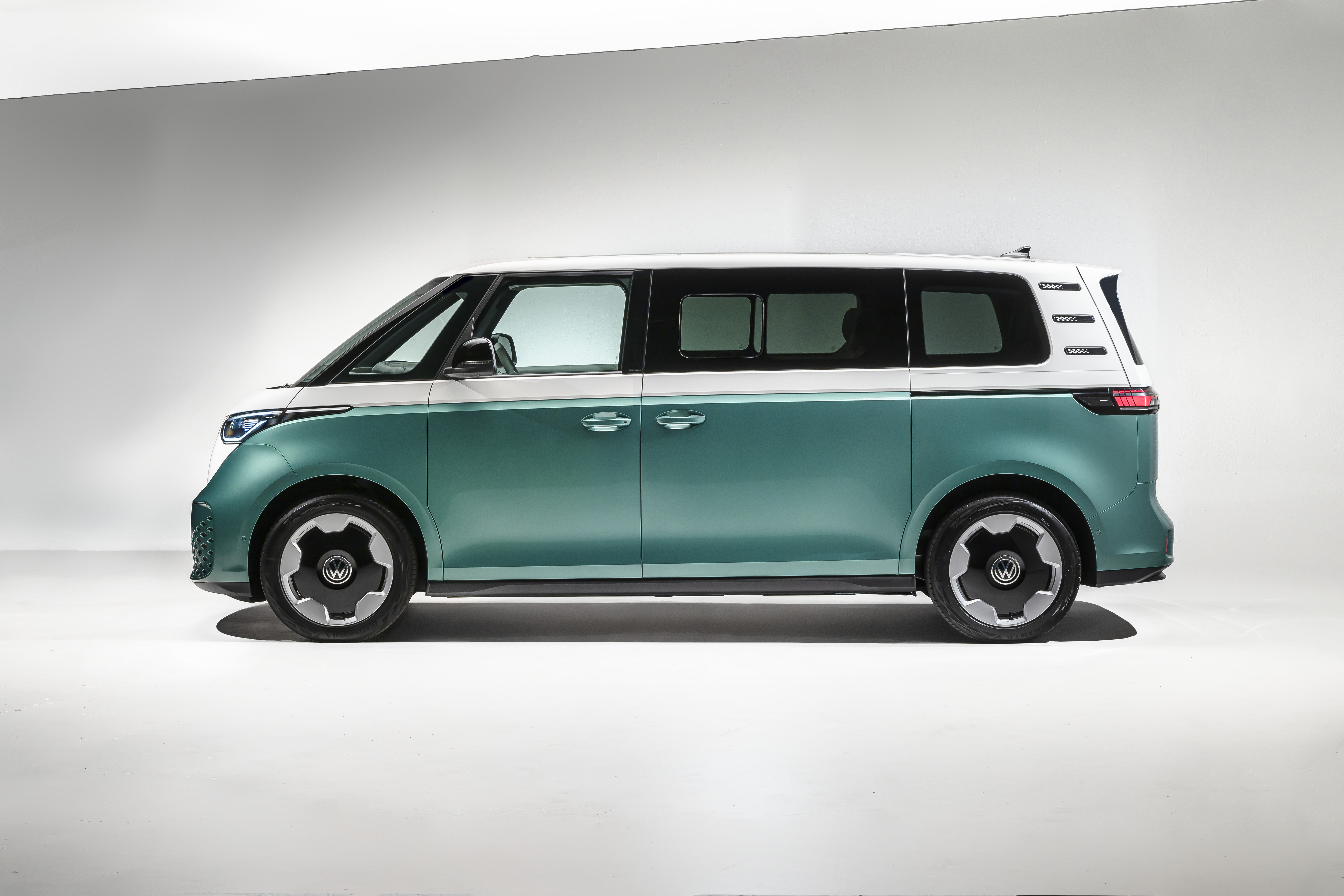 Ny dimension. Designen av ID. Buzz med en lång hjulbas (internt kallad Long Wheel Base, eller kort: LWB) skapades parallellt med Normal Wheel Base (NWB)-versionen. Redan under utvecklingsprocessen säkerställdes att båda modellerna har de typiska harmoniska proportionerna och stilistisk klarhet som en VW-buss, trots sina olika hjulbaser. NWB-versionen är 4 712 mm lång, den nya LWB-varianten mäter 4 962 mm. Längdökningen sker genom en utökad hjulbas, från 2 989 till 3 239 mm. De extra 250 mm fördelas mellan skjutdörrarna, som har breddats med 192 mm, och de 58 mm längre områdena mellan C-stolparna och bakhjulen. Båda modellerna är 1 985 mm breda utan ytterbackspeglar och upp till 1 927 mm höga, beroende på utrustning. Cw-värdet, som är mycket bra för en buss, är 0,29.