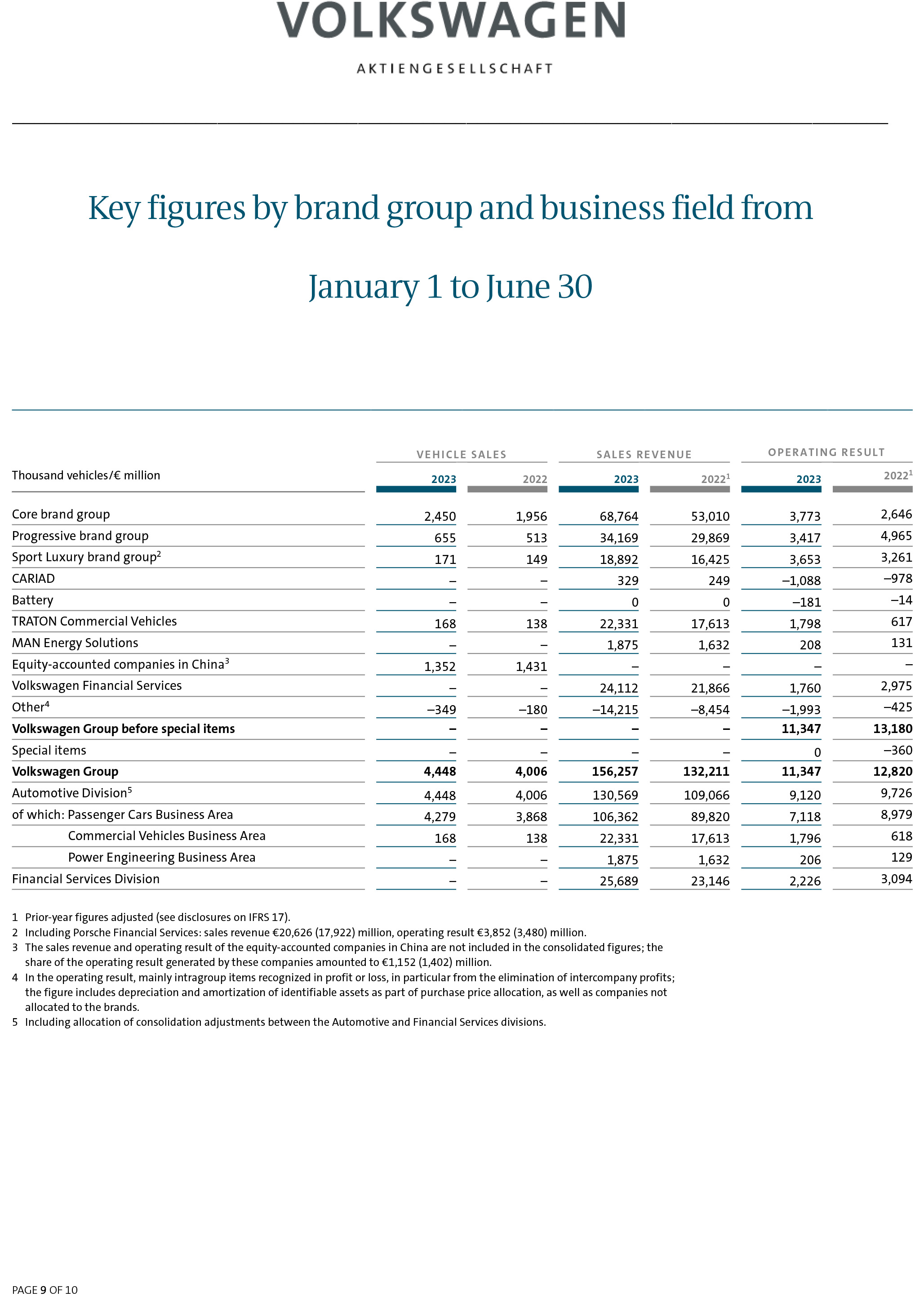 De totala intäkterna ökade med 18 procent till 156,3 miljarder euro under första halvåret (första halvåret 2022: 132,3 miljarder euro), drivet av en fortsatt återhämtning i volym samt en solid mix och prissättning. Fordonsleveranserna minskade med 1 procent i Kina, även om det fanns tydliga tecken på återhämtning mot slutet av rapportperioden. Sammantaget såg koncernen en fortsatt god efterfrågan.