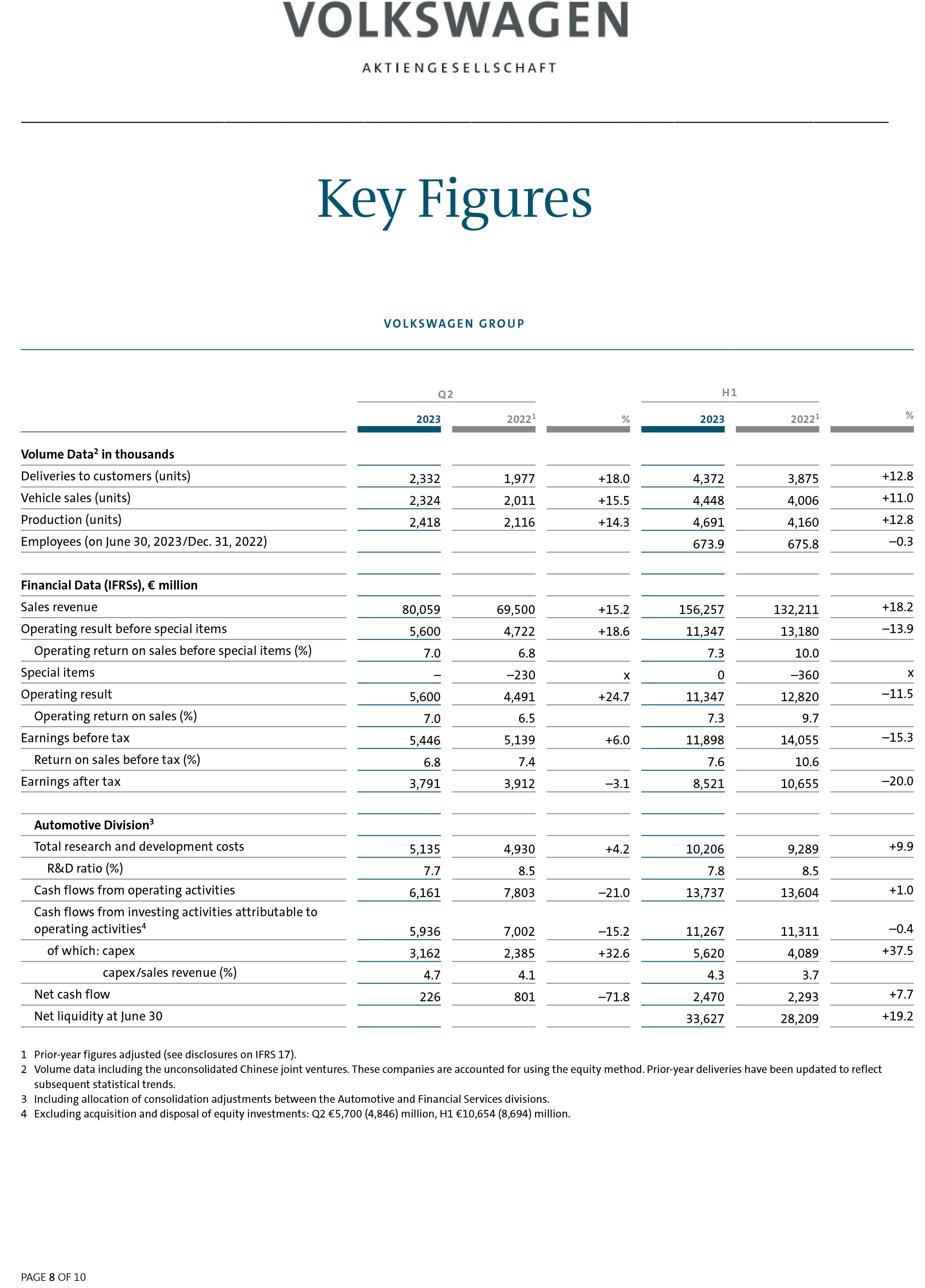 • Arno Antlitz, CFO och COO för Volkswagen-koncernen: "Under första halvåret uppnådde vi solida finansiella resultat och tog stora steg för att förbättra vår konkurrenskraft. Fokus för andra halvåret ligger nu på att stärka nettokassaflödet. Med lanseringen av prestationsprogram för alla märken och våra strategiska beslut i Kina kommer vi att förbättra Volkswagen-koncernens konkurrensposition ytterligare."